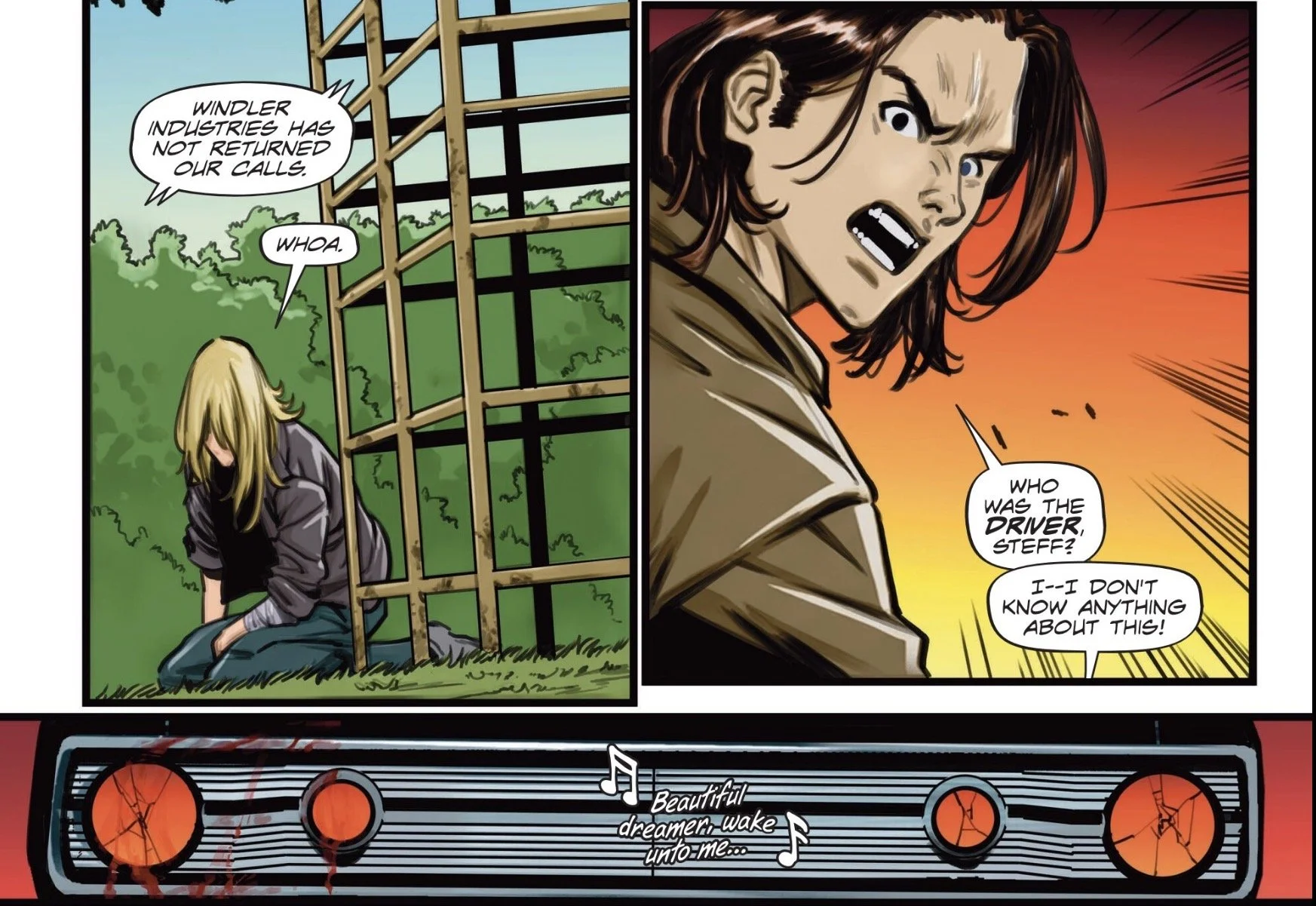 During the chase, the haunted car shows up again, first appearing to attack them but then helping against the Windler lackey. Its radio suddenly comes to life, playing a news report from a decade ago about a drunk driving death in Pittsburgh. The driver apparently came from a Windler Industries brewery, but the company never responded to calls. The boys ask Steff who was driving that car, but before she can answer, the haunted car target her - well, guess that counts as an answer…
