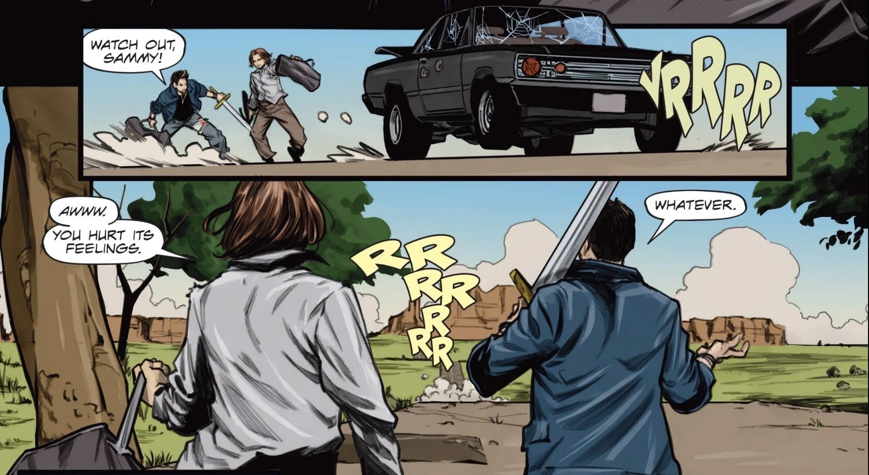 Back in the present, Sam and Dean are both bleeding from the gunshot wounds they gave each other - Sam’s in the shoulder, Dean’s in the thigh. They are trying to figure out how far to the nearest town when the haunted car appears again, much worse for wear following last issue’s battle with the zombie cowboys. Dean says they should burn it,so it locks the doors, pops the trunk so they can get their gear out, and drives away! Guess he hurt its feelings.