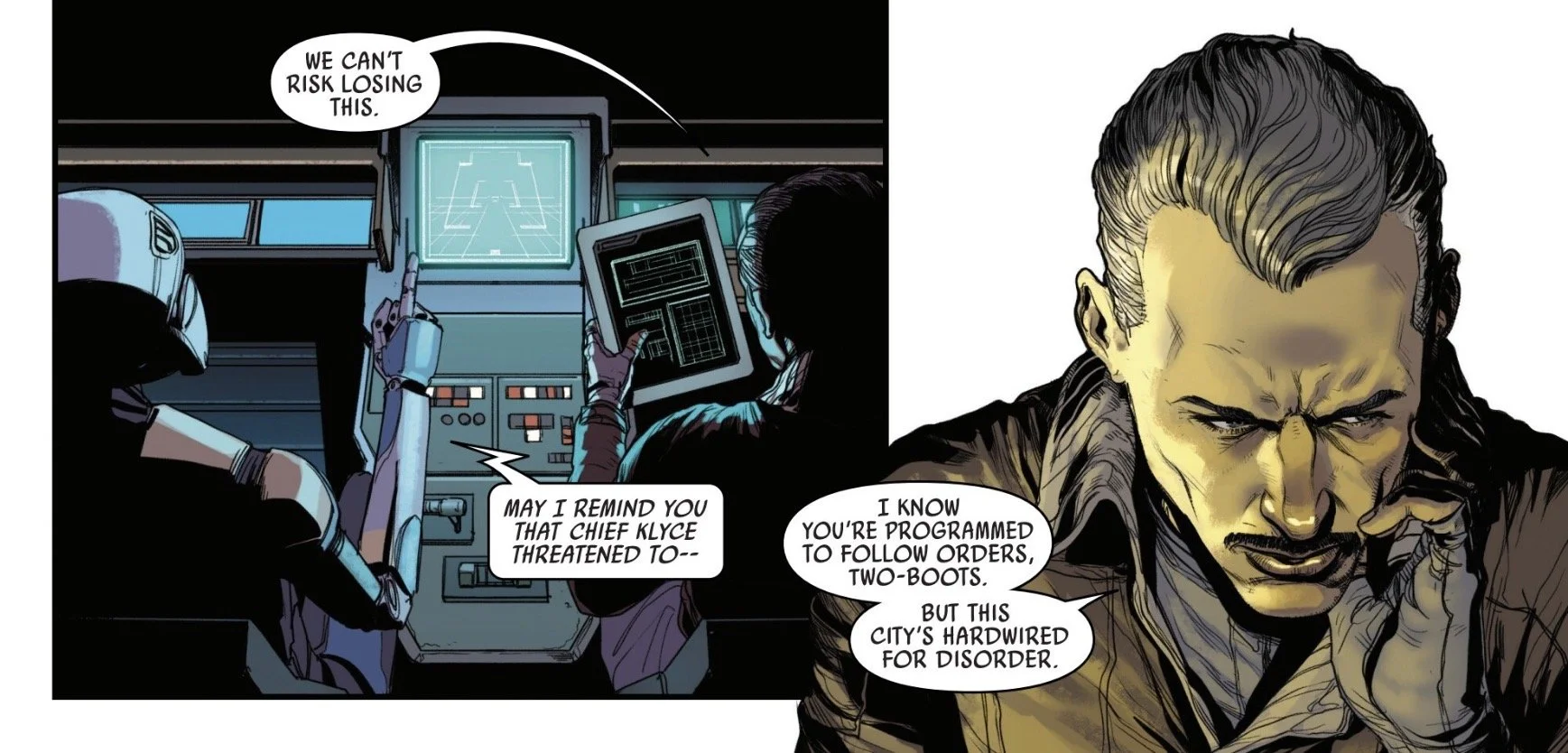 Captain Brander Lawson of the Janix Civil Defense Force and his droid partner, Two-Boots, are still working to bring down crime lord Nico Deemis. After the betrayal within his unit last issue, Lawson has decided to work outside of the system in order to keep Deemis from finding out what he's doing. The partners find themselves on an old-fashioned stakeout, watching the crime lord enjoy dinner at a high-end restaurant in the company of politicians and business leaders. Deemis gets a message and excuses himself, which is very unlike him.