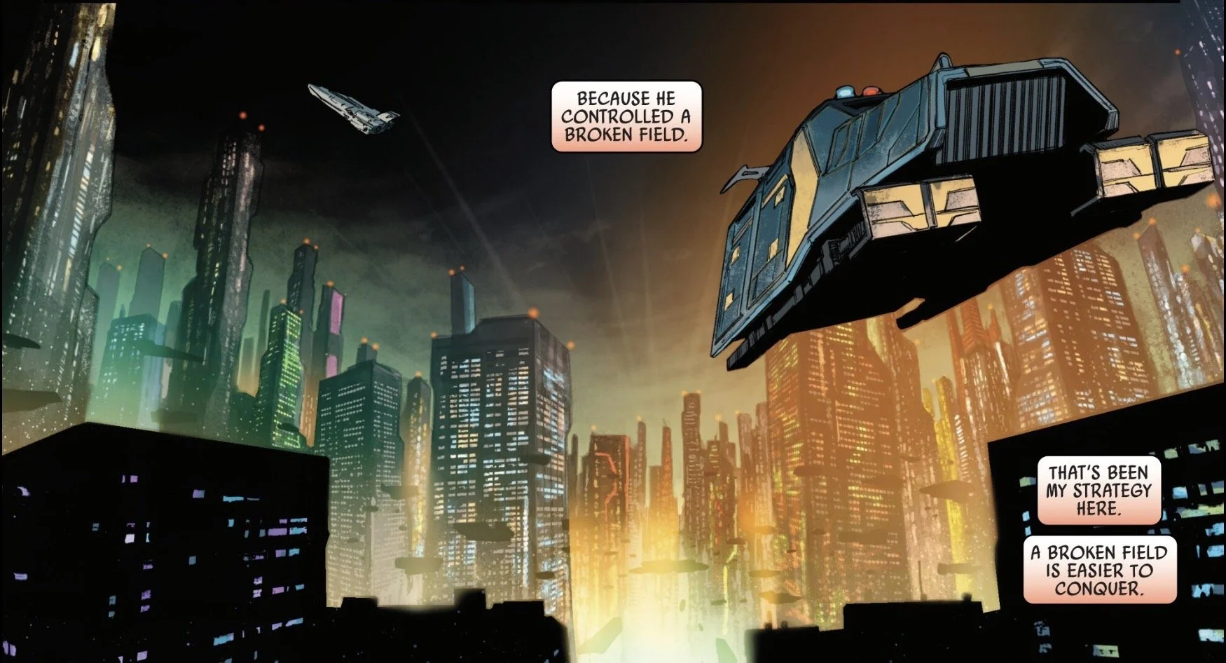 Our creative team is again the duo of Benjamin Percy and Madibek Musabekov, working as writer and artist, respectively. Percy has established the corruption of Janix well, and given Captain Lawson the depth needed to stand out as a possible beacon of light in the darkness. His pacing is solid, taking us from stakeout to tailing to chase, back to stakeout, with no lull in the proceedings. And his closing scene works well to establish the looming menace of Maul.