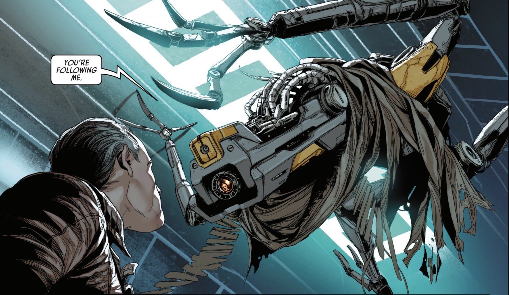 On the art side, Musabekov does a good job showing the darkness and grime of Janix, juxtaposed with the neon lights that try to hide the seedy underbelly. The issue’s main action scene against the strange droid is well-rendered and easy to follow in terms of what’s happening. The arms deal meeting works well to showcase the intimidating size of Deemis and how “lessers” react to him. In the closing scene, the art does a great job establishing the quiet menace of Maul.