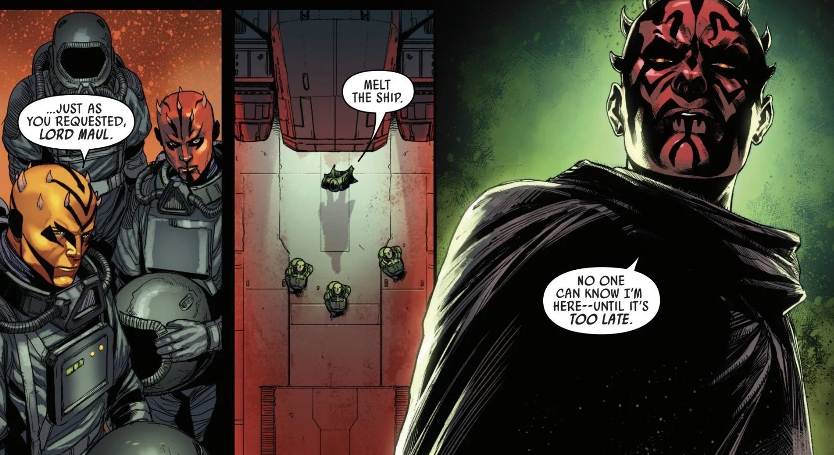 As the issue draws to a close, we see a ship arrive on Janix and dock at the metal yards, where it is met by a group of Zabrak. The pilot exits the ship and commands them to melt the ship, ensuring no one knows that Darth Maul is on Janix until it is too late…