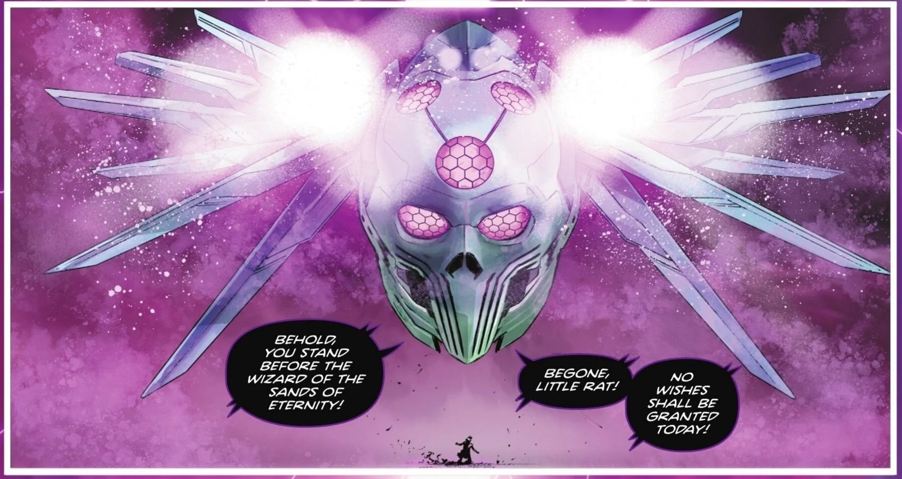 Purple light appears overhead as a strange, yet sinisterly familiar vessel appears overhead. The vessel declares itself as the Wizard of the Sands of Eternity and tells Teth-Adam to begone, as no wishes shall be granted today. The defiant boy refuses to leave and demands to be heard, insisting that he will become the savior this world needs. Before he can finish his sentence, however, he’s quickly teleported within the vessel as two Brainiacs muse over what to do with this slave. They are about to consider turning him into a camel when they realize that his mind contains such rage and ambition as to be worthy of note. After a brief debate as to what sort of enhancements or improvements to put inside the boy, the Brainiacs decide to utilize the strange, untested device (i.e., the Father Box) they found within a black hole, if only to see how it would kill the boy.