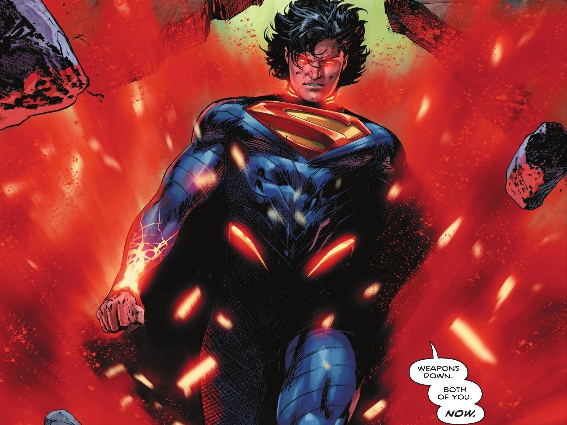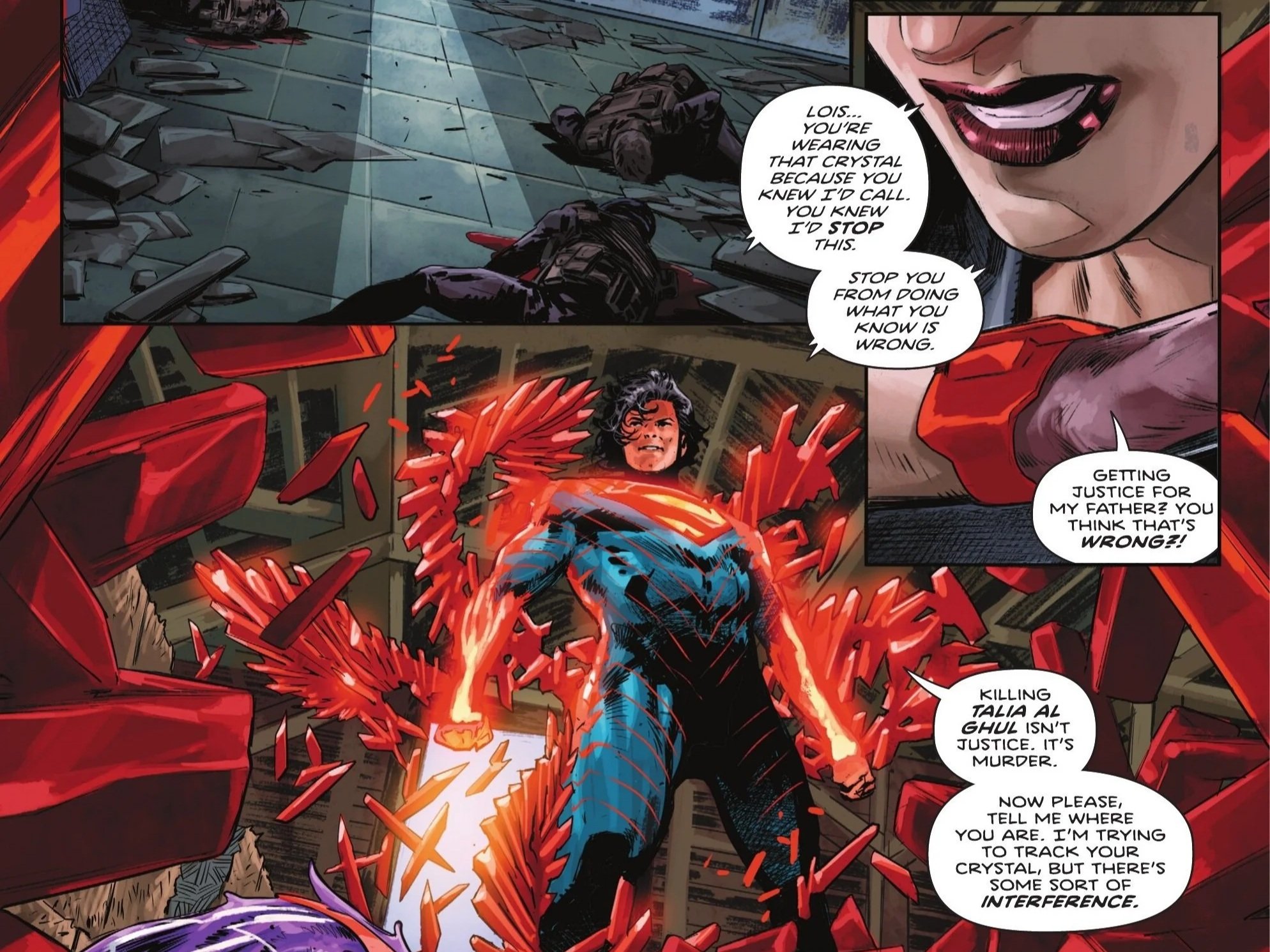Talia tells him to shut up as they have company, just in time for Lois to appear, gun pointed at Talia.  Ra’s attempts to escalate the situation as both women tell him to shut up.  Lois tells Talia that she’s here to kill her for murdering her father as Talia bitterly offers up her own father to make them even.  Lois declines the offer, reminding her she’s here to kill Talia.  Just as Talia smugly tells her that she’d need an army to do such a thing, the wall suddenly explodes as Superman arrives, eyes smoldering.  He tells the ladies to put their weapons down before telling Ra’s he’ll deal with him in just a second.