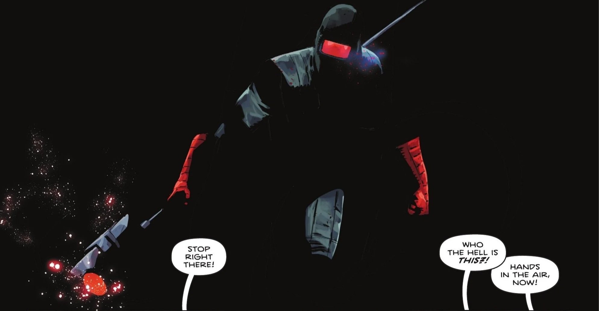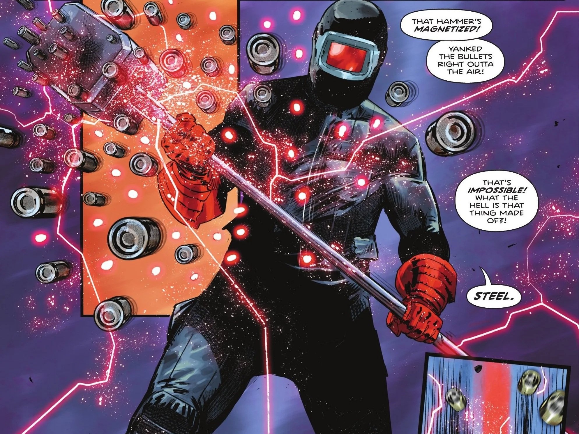 Neither woman is inclined to listen to Superman even as he warns Talia he could disarm her and Lois both in less than a second, but Talia tells him it’s not her sword he should be worried about as the tell tale activation of a Father Box rings through the air.  Elsewhere in the abandoned building, a group of Peacemaker Corpsmen standing on guard encounter a mysterious figure wielding, of all things, a giant hammer.  The Peacemakers open fire but are shocked to realize that the hammer is magnetized and yanks the bullets right out of the air.  As they ask what the hell is that hammer made of, the masked figure only responds with “steel”.  The figure effortlessly plows through the Peacemakers before telling one of the guards that they crushed the suit’s main power line, rendering them out of the fight.  The guard asks how they could possibly know that as the hammer wielding stranger reveals that they’re the S.O.B who built it.