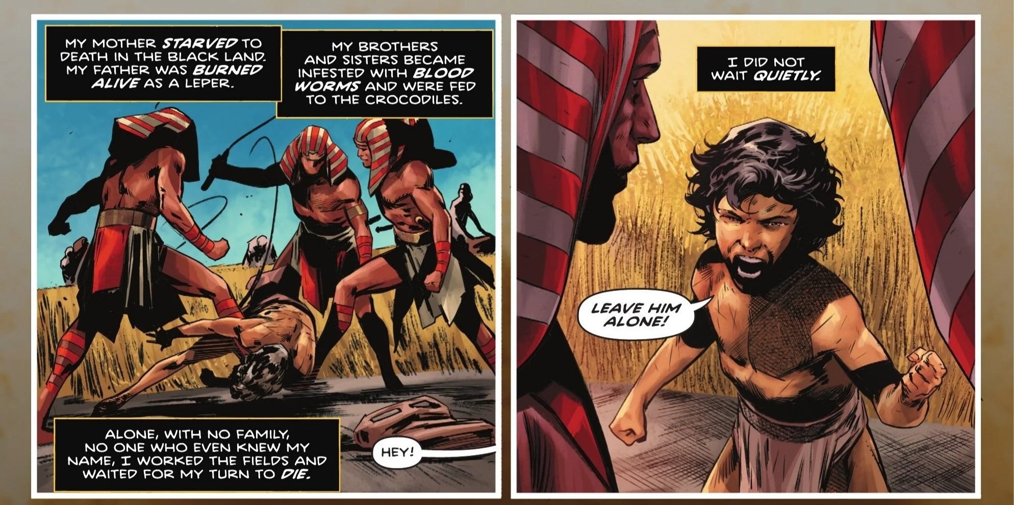 Our issue begins over 3,000 years ago, back in ancient Egypt. We’re met with a harrowing sight: slaves being whipped and brutalized by the forces of the Pharaoh. The narrator explains that he and his family came from the east, a region known as Kahndaq. As an elderly man is beset upon by the slavers, the narrator explains how each of his family members met tragic or violent ends. He was left to wait for death, but he did not wait quietly. A young boy, whom we presume to be the narrator in question, protests the mistreatment of the old man, telling the Pharaoh’s slavers to leave him alone. They dismiss the boy, opting to execute the old man, as he wasn’t worth beating. The guards then turn their attention to the boy, whom they decide is worth beating, as we are informed of his name: Teth-Adam, which translates into “mighty man.”