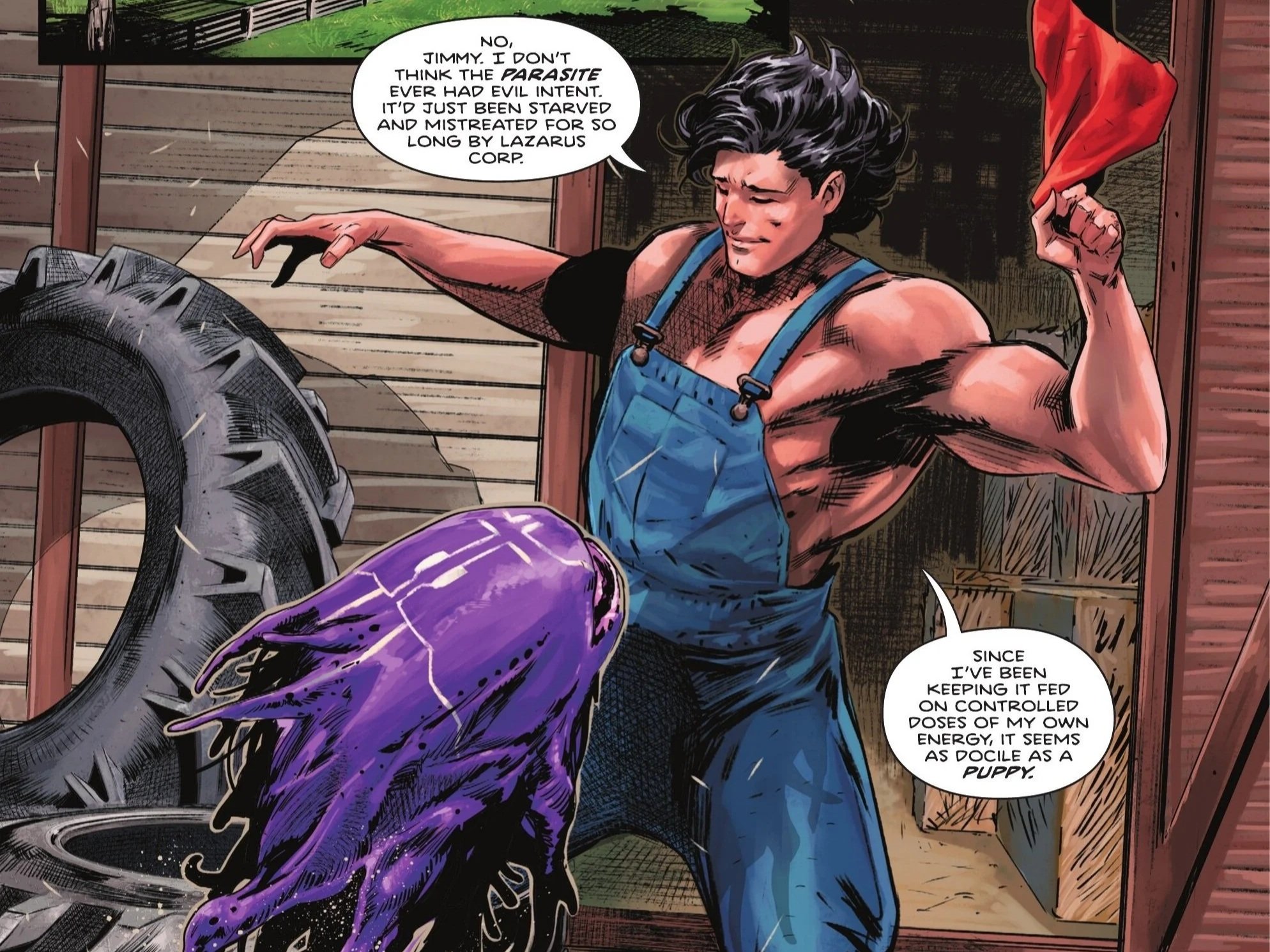 Back in present-day Smallville, we see Kal-El attending to a much more docile—and even somewhat domesticated—Parasite, as Jimmy speaks to him through a special crystal watch device. Kal explains that since he’s been keeping Parasite fed with controlled doses, the creature isn’t dangerous or showing any sort of evil intent. Parasite bites Kal on the arm, who chides the creature and reminds it of the no-biting rule (to which Parasite adorably responds, “but us like bite”). Jimmy explains that the new gig at the Daily Planet might not be for him, given all he does is enter A.I. prompts when he’s not being berated by co-workers. Kal mentions that at least Jimmy has Lois there with him, to which Jimmy responds by revealing that Lois never showed up for her interview.