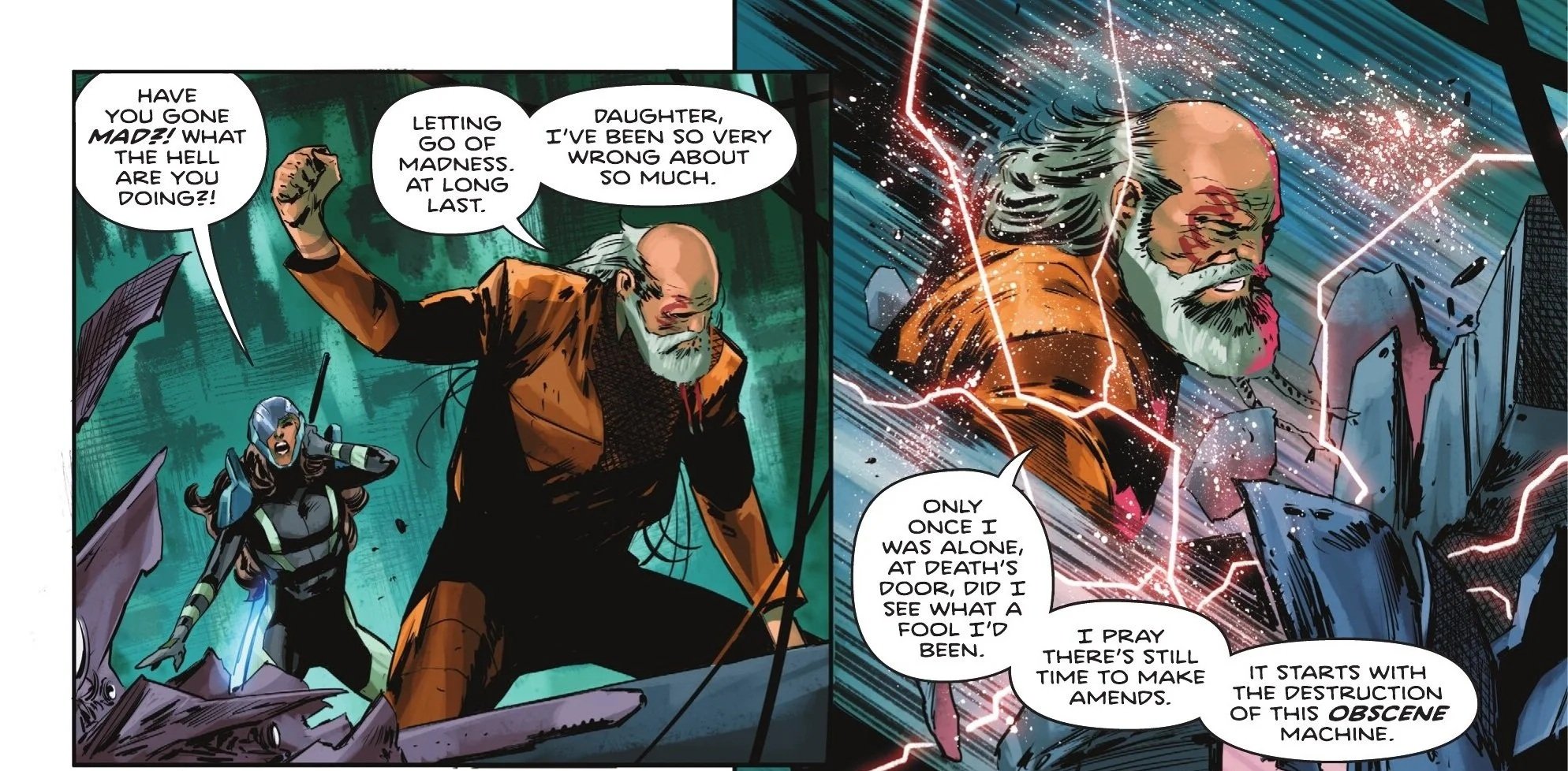 Ra’s explains that he read to him. Disgusted, Talia asks what he could have possibly read to him to change him so much, to which Ra’s explains it wasn’t the book itself, but the man who brought it—the man who took time to try and save the soul of his tormentor. Ra’s truly wishes to make amends for the greatest of his sins, but Talia won’t hear it. Armed with her energy sword, she shouts for her father to get back into that pit and return her father to her.