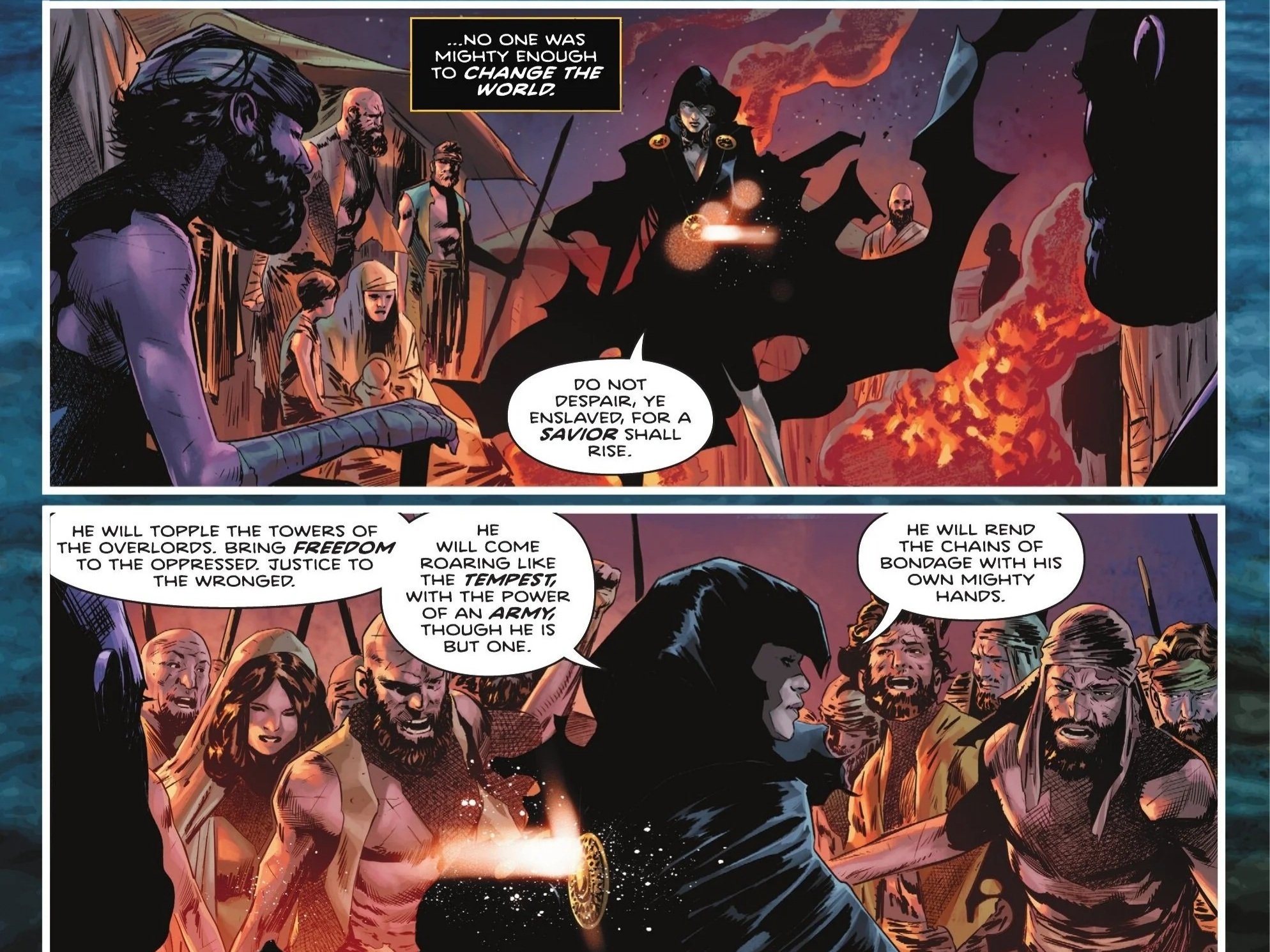 Later that evening, as Teth-Adam recalls the way of the world—and how it was to be expected for the Pharaoh to dine on the fruits of their labor while he and the other slaves ate poorly—the slave camp is visited by a mysterious woman draped in black. This woman proclaims that the enslaved should not despair, for a savior shall rise, toppling the towers of the overlords, bringing freedom to the oppressed and justice to the wronged.