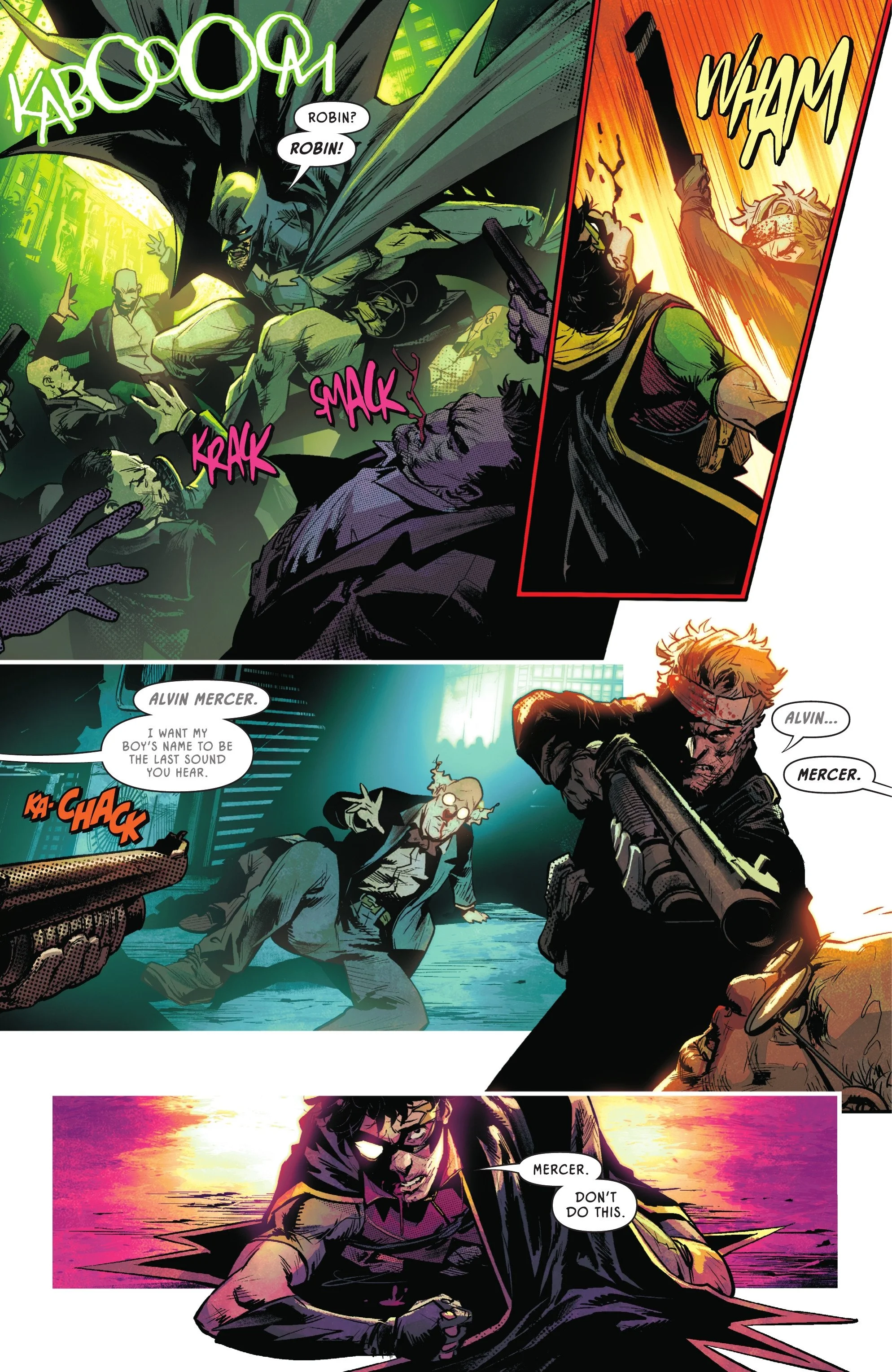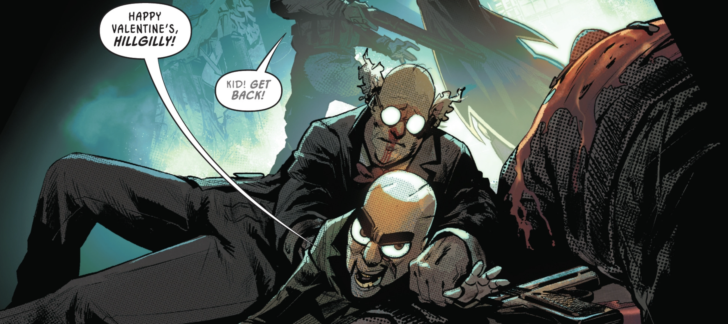 Scarface, down but not out, reaches for his Tommy gun to finish Robin, but it’s Mercer who saves the boy’s life, taking bullets for Bruce’s son. Beautiful writing from Phillip Kennedy Johnson, because Quiet Man’s whole story has been about avenging his son’s death at the hands of Scarface. Yet, here in the final scenes of the story arc, he saves someone else’s son from Scarface, bringing the story full circle.