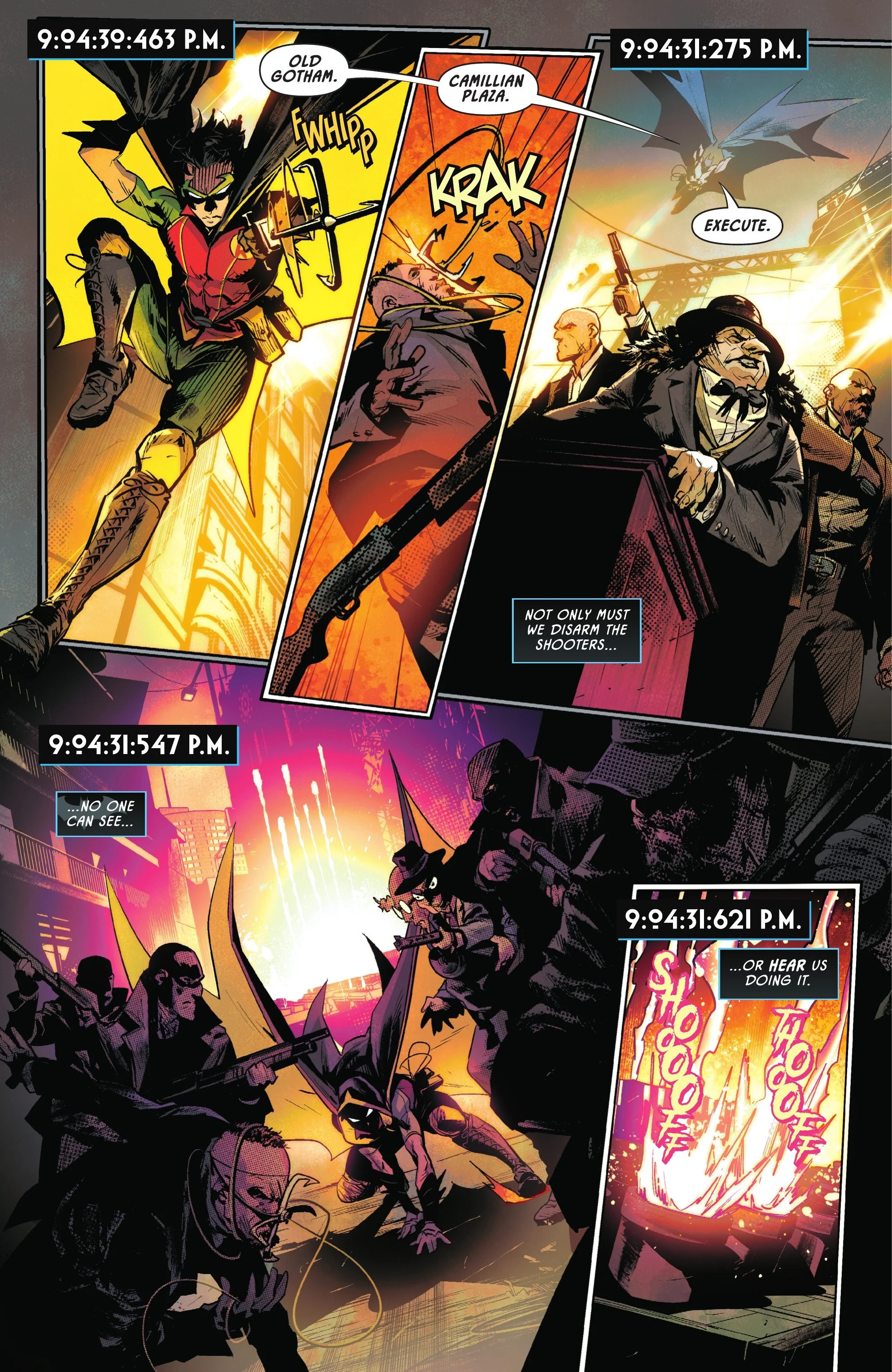 Phillip Kennedy Johnson’s timing has been terrific throughout this run, and he caps it off perfectly here. By page five, the tension is already at a breaking point. PKJ invites the reader to take the plunge, diving straight into a cacophony of chaos orchestrated by a trio of enigmatic villains: Quiet Man, Penguin, and Scarface.