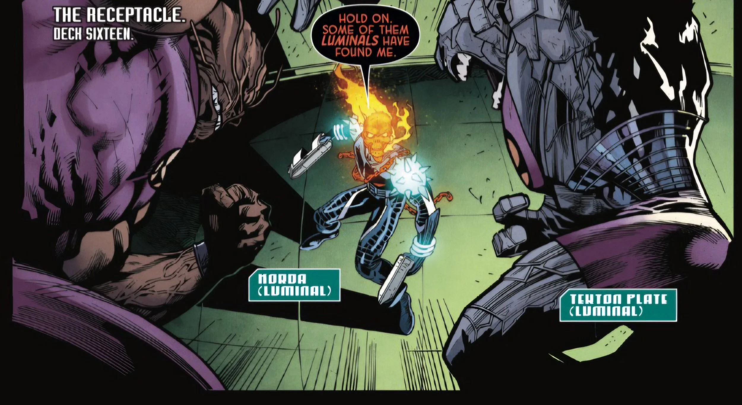 ​However, where the story falters slightly is in the introduction of the Luminals—basically the "Avengers of Xarth." While Gamora leads the team into a kinetic skirmish against these local heroes, the tone shifts significantly toward the slapstick. We go from a somber meditation on war crimes to Cosmic Ghost Rider being a chaotic nuisance and Brawn cracking jokes. I’m all for levity in comics, but the transition here felt a bit abrupt. One minute we're mourning the dead of Hala, and the next we’re watching a colorful brawl against alien tropes who, frankly, don't feel like a real threat.