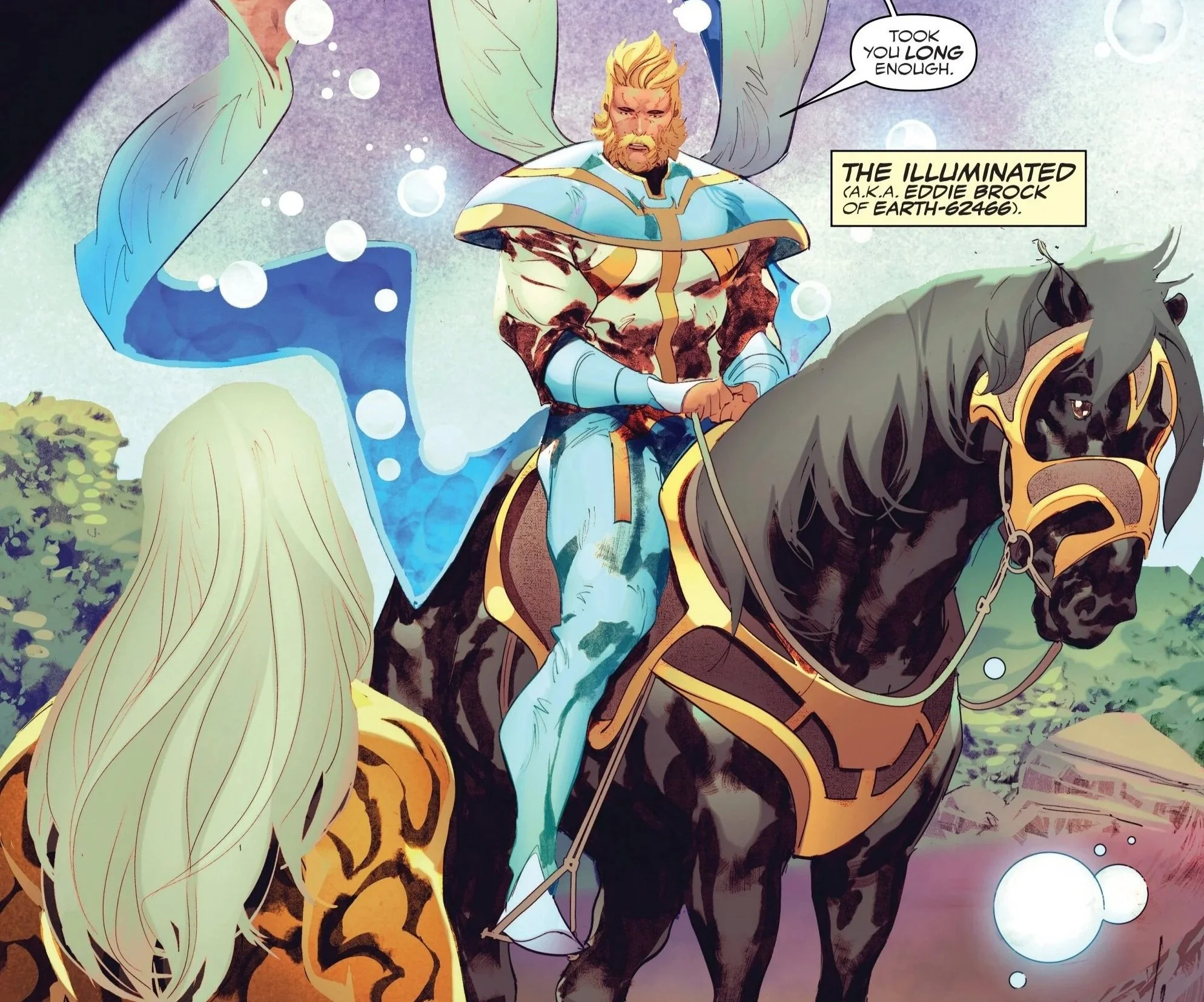 So yes, of all the cosmic entities, eternal forces of the universe, and beings of infinite power out there, Knull chooses to become Eddie Brock’s biggest hater of all. It would be unbelievably petty—yet hilariously on-brand for Knull—but there’s also the small catch that Eddie is somehow the one who will help him ascend to new heights of power. How, you may ask? Well, by the time Knull reaches his destination, he finds himself confronted by the thing he needs and the thing he hates most: the Illuminated—an Eddie Brock who is pretty much… well, you’ll see.