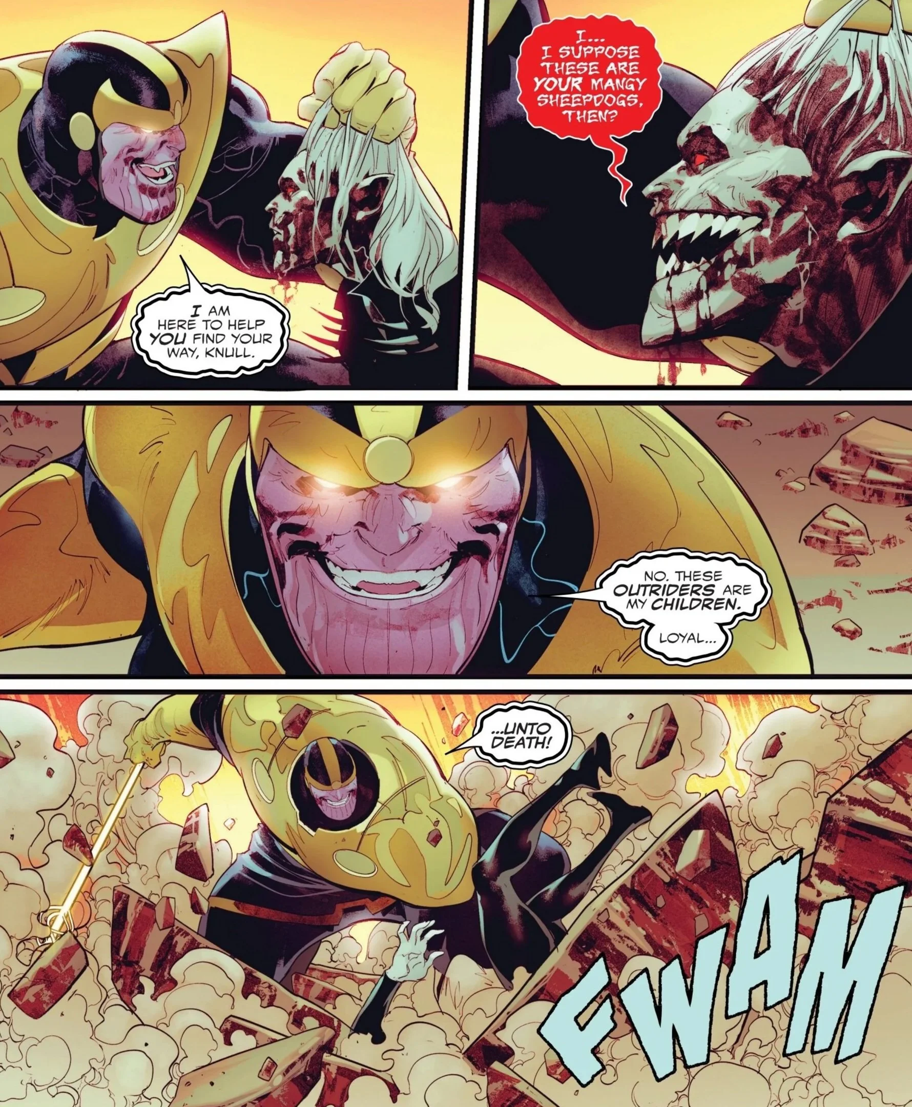 It’s a hell of a bait-and-switch, with Thanos smugly and confidently pontificating about his own history and relationship with Death itself. There’s definitely some merit to how Ewing and Waltz write Thanos, because he’s everything you’ve come to expect from the big guy, complete with his well-earned swagger and air of utter domination. Indeed, that domination carries over into how he pretty much manhandles Knull while talking through his breakup issues.