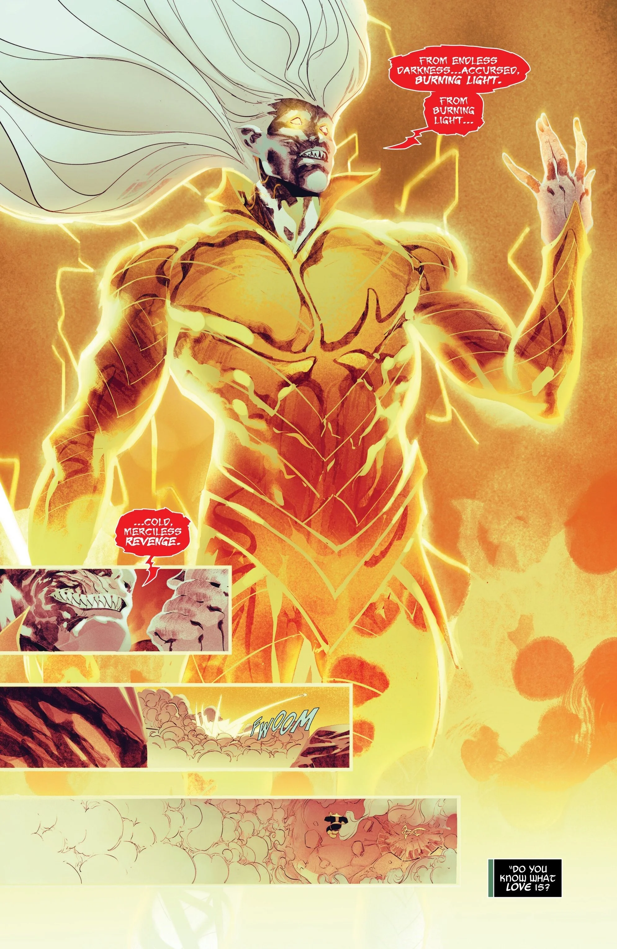 Helping tremendously on this front are Arciniega’s colors, which make full use of both blindingly bright shades and deep, shadowy contrasts in this pivotal chapter. The brutality of Thanos’s assault on Knull is amplified by the iconic purples and blues of the Mad Titan against the jet-black, inky shadow of Knull—an effect that explodes into light when Knull claims the god weapon, All-Light. I love the distinction here: this isn’t some hopeful, feel-good change just because Knull has embraced the All-Light. It’s harsh, unforgiving, the kind of blinding energy that could literally melt your retinas, and it radiates from him every time he channels this new power as he continues to ascend.