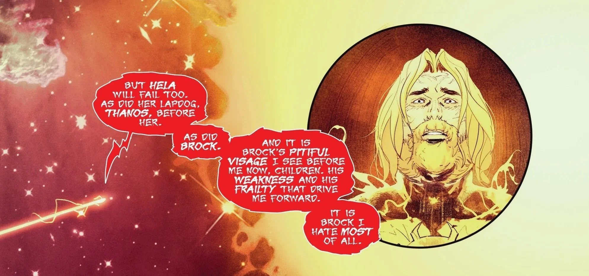 The issue kicks off in the best way possible: a Thanos monologue. We get a quick little recap of all the great things Thanos has done, along with how he got over his ex, Death. It’s short, sweet, and sets the context for Thanos now working through his therapy issues by beating the ever-loving bejeebus out of a weakened Knull, all while waxing eloquent about how much he resents both his ex and Knull for not living up to their true potential. You know—typical incel Thanos stuff. Either way, Thanos has the upper hand for pretty much the entirety of the fight, and that’s without even using the All-Light spear, before Knull manages to get the drop on him and pulls what we like to call a “bitch move”: taking the Mad Titan out and making a quick getaway with the spear. If fights could get any more anticlimactic, it would be hard to top this.