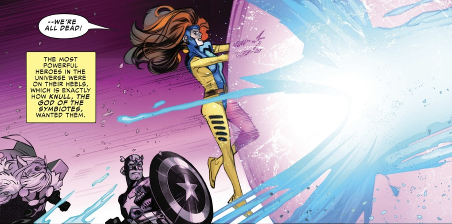 With the Avengers, X-Men and other heroes all gathered on the Rainbow Bridge, Godzilla begins making his approach towards Asgard and seemingly the last bastion of hope for Earth. Thor and Beta Ray Bill decide to attempt to stop him before the real battle can begin and head out into space to confront the now cosmic-powered Godzilla. Thor and Bill give it their best shot but even with a massive attack with both Stormbreaker and Mjolnir, Godzilla barely feels a tickle as he slaps them both back down to the Rainbow Bridge. The battle heats up as the X-Men and Avengers do whatever they can to turn the tide in their favor but Godzilla is proving to just be too strong for the combined might of Marvel’s mightiest teams. Knull makes his entrance and approaches Asgard with nefarious plans in mind…