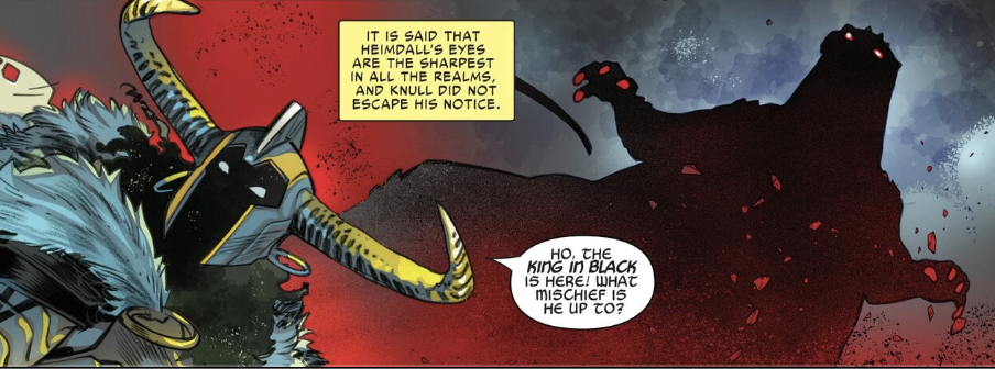 We’ve talked a lot about the narrative choice in this issue but I want to make sure I give the art team their flowers here as well. IG Guara and David Curiel have put their foot on the gas and they are not letting up. Especially for a book that features massive Kaiju battles, you need your art to be on point and there are some great highlights from them in this issue, beginning with a panel on just the second page of the issue with a really cool image of Godzilla slithering his way across the cosmos. I just love how lizard-like he looks in the panel and how intense his eyes look. Thor and Beta Ray Bill’s brief battle with Godzilla looks great and features a truly electrifying panel of Godzilla taking the full blast of a combined Mjolnir and Stormbreaker. I love this art team’s take on Knull’s design as well because you just get this sickly feeling every time you see him on the page; he looks like a living, breathing infection.