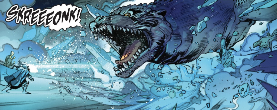 Godzilla’s battle with the heroes continues to rage as another piece enters the game: The Silver Surfer! Even after Silver Surfer launches his silver board through Godzilla and rips a hole in him, it still isn’t enough as Godzilla grabs the Surfer within his grasp and attempts to squeeze the life out of him. I’m glad I get to live in a time where I get to write that sentence. With the battle looking grim and defeat seemingly imminent, Odin takes a massive gamble and opens up the Casket of Ancient Winters.