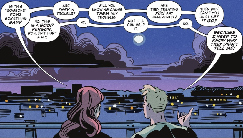 I want to give a further shoutout to Delpeche’s art style here as well. Delpeche’s style has the feel of a more classic age of comics to it, and since this entire run has been spent in the past, I think it adds a really nice dimension to this story in particular. I also love the use of light and shadow in the art for this issue. Many times in this issue, a silhouette of someone is used instead of showing their full detailed figure, and that stylistic choice really benefits the scenes it’s used in. For example, when we see Pete go over the camping night in his mind, he sees the outline of Clark, but the “S” shield is vibrant and detailed. It really drives home the focus of the scene: how that symbol is the focal point of the change in Pete and Clark’s relationship.