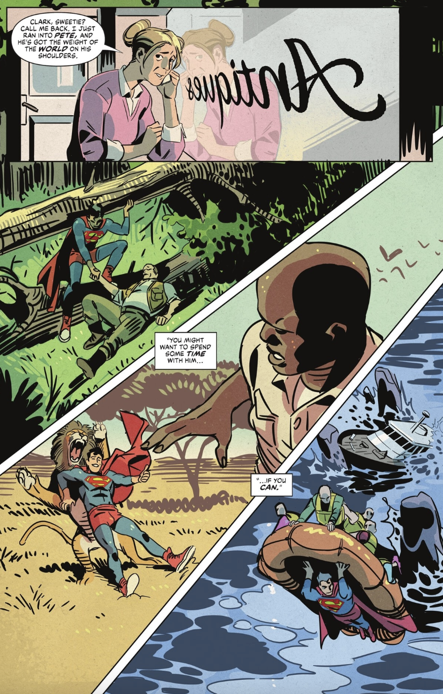 During this section of the book, we get possibly my favorite page of the issue, with not only great writing but some fantastic art from Patricio Delpeche. Martha Kent gives her son a call and asks Clark to spend time with Pete soon, if he can. She says Pete looks like “he’s got the weight of the world on his shoulders.” On this page, we get three big panels of Clark rescuing people around the world. First, he saves a man from being crushed by a falling tree in a forest; next, he saves a man from being attacked by a lion on the savannah; and finally, he saves some sailors on a lifeboat from a capsizing ship. While Pete may emotionally feel the weight of the world the past few days, Clark literally has the weight of the world on his shoulders every day, with the destiny that has been thrust upon him. This entire page was just a microcosm of why this run has been so good so far.