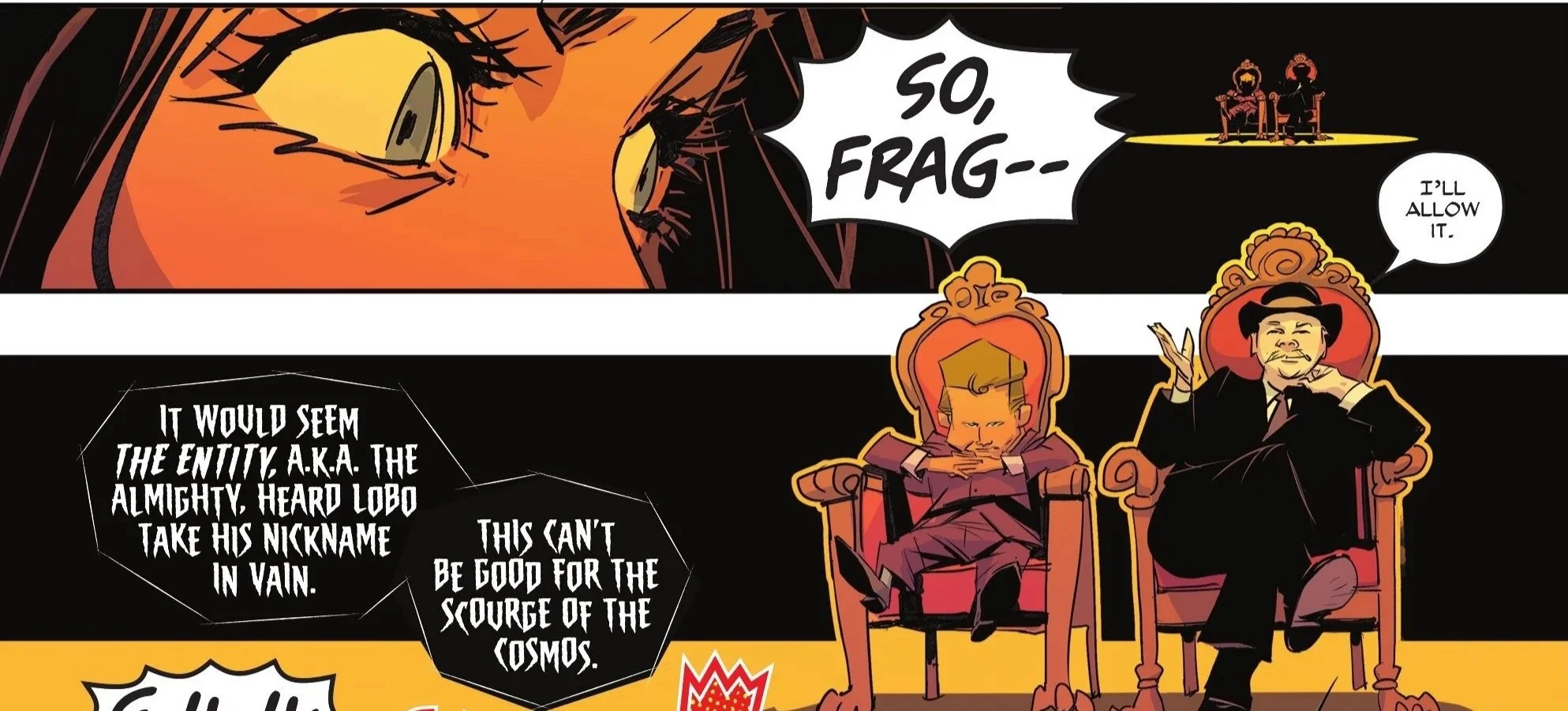 Granted, some fans are prone to shout, “Oh, plot armor,” which just makes me chuckle and nod my head. Yes? Plot armor is literally what has kept Lobo alive all these years. The plot dictated that The Presence—aka the Almighty—bestowed the inability to die onto him. Being granted immortality (especially by God with a capital “G”) is literal plot armor! And the way Lobo lost said plot armor absolutely checks out in the sense that his vulgar and uncouth nature kicked in at the wrong (or right, depending on your definition) moment. I understand power-scalers and feat-fanatics are going to take issue with some of these fights and cry about the nature of the plot and the writers’ “rigging” of the events. Still, given the silly nature of this whole fight, I personally can’t be bothered with complaints regarding power levels and abilities.