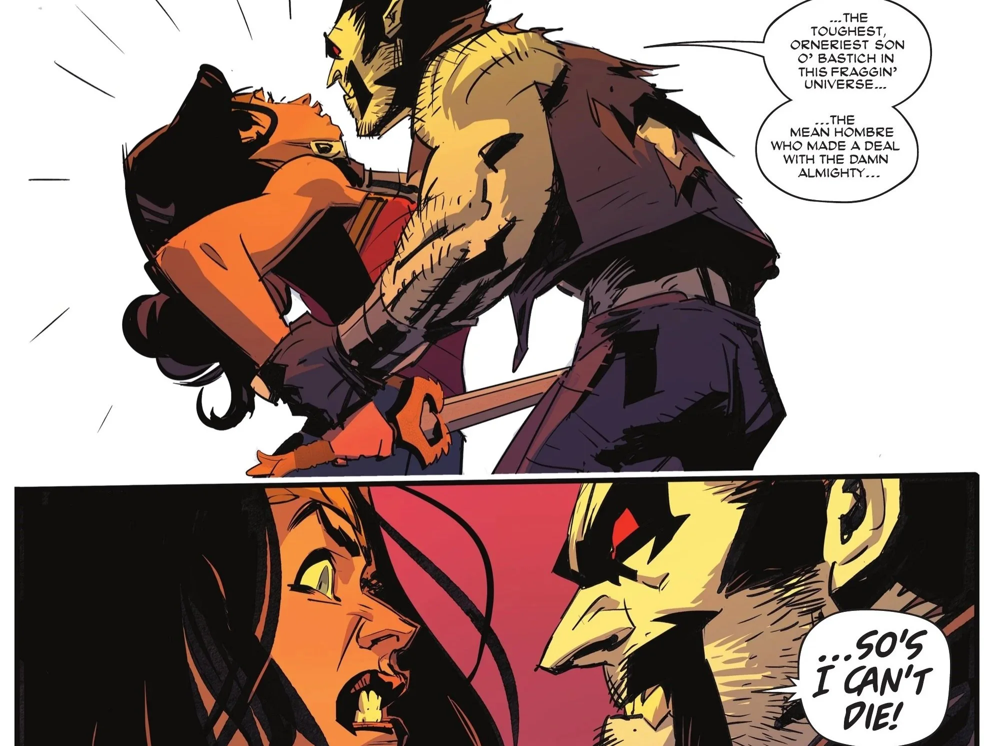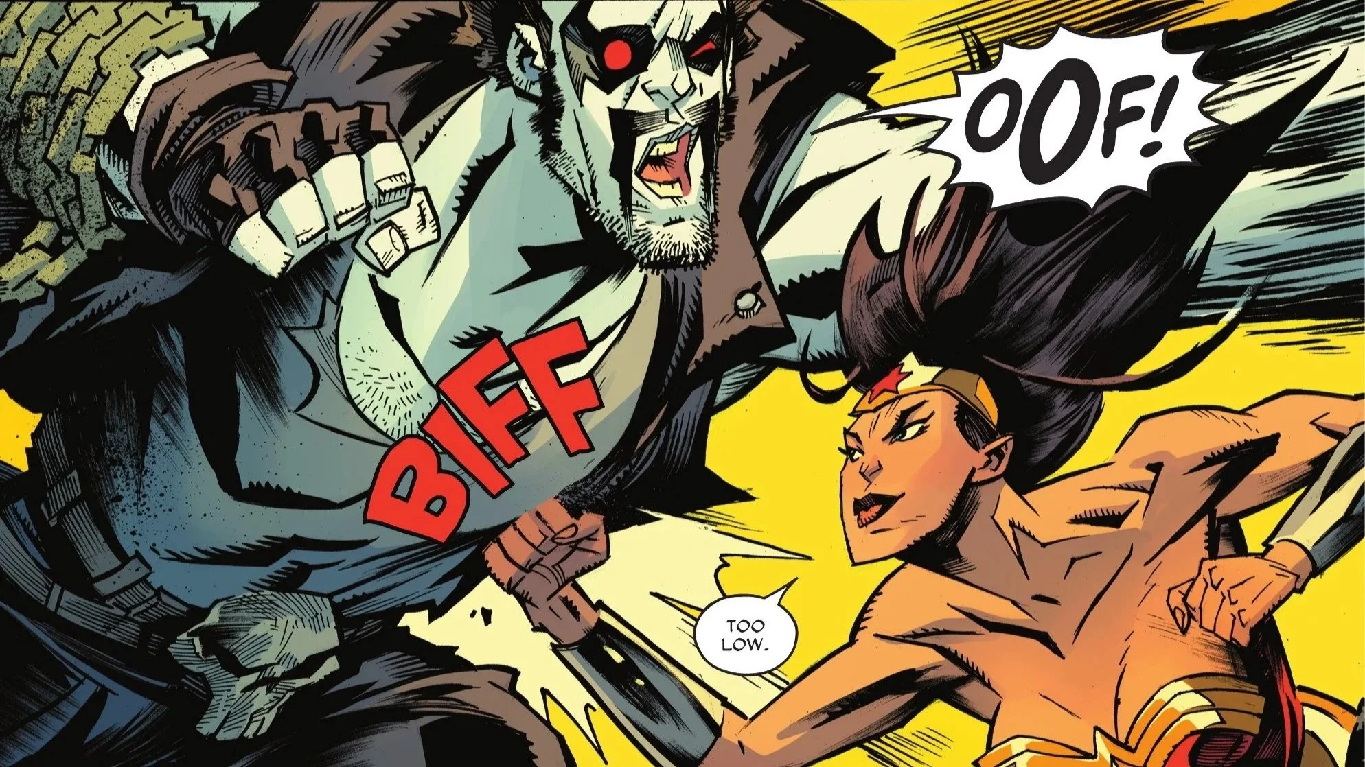 A well-timed explosion later and the two are once again up close and personal with one another as Wonder Woman goes to strike Lobo with her sword despite his iconic chained hook grasping her. The Main Man breaks her wrist and gloats, bragging to her that no matter how she tries to end him, he simply cannot be killed—and it’s because of a deal he made with the damn Almighty himself!