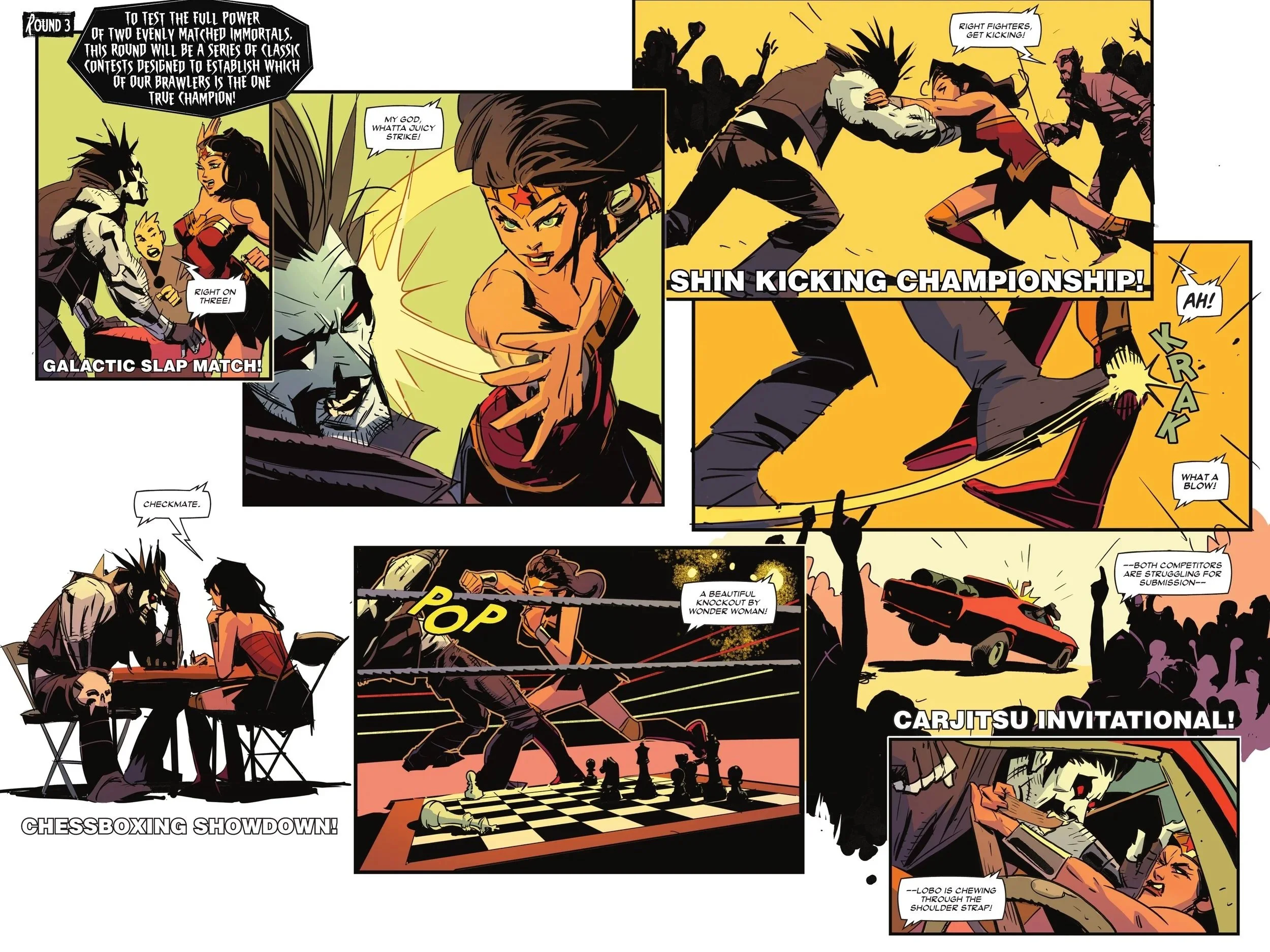 Finally, we get to our third round, which is ultimately a series of various contests to see which of these immortal beings has a leg up on the competition. There’s slap fighting, shin-kicking, chessboxing, and even “Carjitsu,” as neither competitor seems to get a clear advantage over the other. Finally, the "final-final" round commences in what is a gladiatorial bout complete with all sorts of armaments. Lobo is quick to start the fraggin’ (though not before another crude advance toward Diana), but Wonder Woman is able to deflect his spray of bullets away.