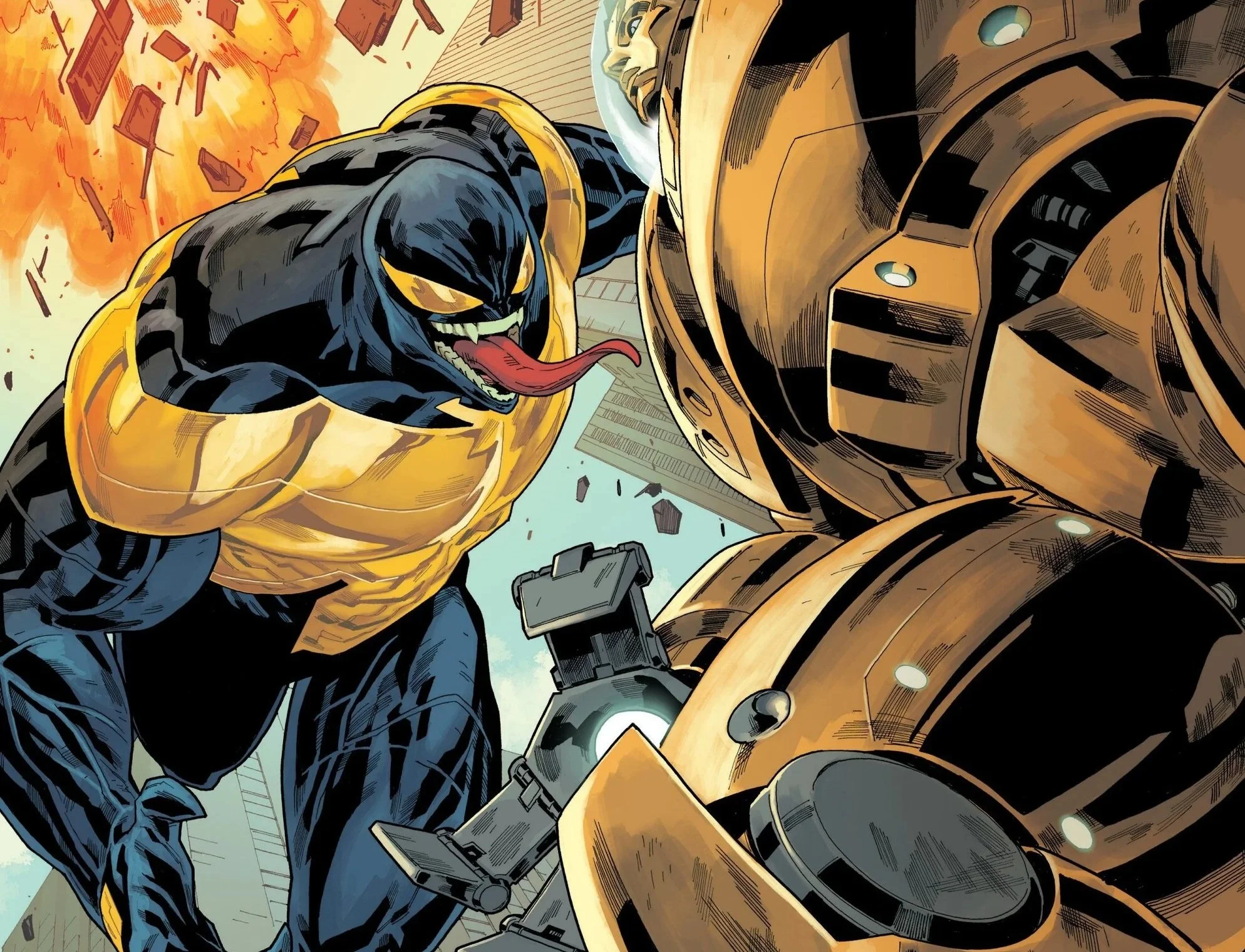 On a MAJOR plus side, however, Carlos Gomez brings some major heat to the fray with some of the zaniest action sequences he’s ever drawn so far. There’s so much clean fighting throughout the book, mixing both the biological aspects of the symbiote's antics with the cold, calculated steel of Masque’s mechanical assaults. Venom coming up with new gooey forms of attack and defense against the merciless assault of missiles and flames is done impeccably, as is the view of all the collateral damage both combatants get up to in their antics. Every punch feels suitably hard-hitting as needed, though I can’t help but notice how Gomez’s drawings of Venom lately, which emphasize larger eyes and a bigger mouth without the teeth and tongue, just seem to give off huge kawaii vibes. Seriously, Venom almost looks cute these days. It is just an interesting observation, especially with how Masque is finally put down for the count in the goofiest way imaginable.