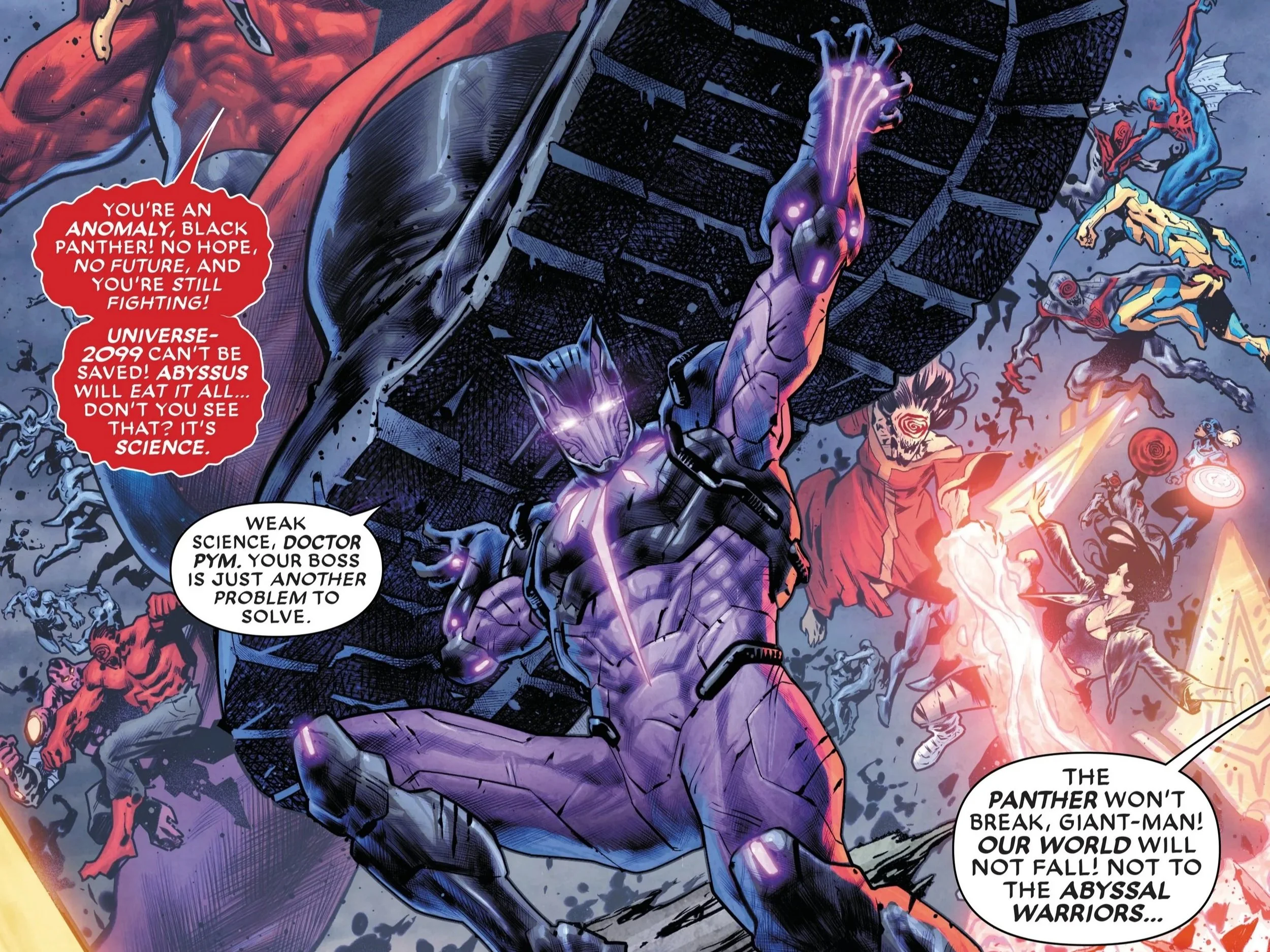 The Abyssal Warriors, now infected by Knull seeds courtesy of Abyssus, are on the offensive as our issue opens with an impressive full-page depiction of the champions of the 2099 reality defending themselves against the symbiote-infected attackers. A corrupted Giant-Man tries to stomp on Black Panther 2099 as he reasons that the entire 2099 timeline should accept defeat, as Abyssus is certain to devour them anyway. But the Panther refuses to submit, calling Pym’s grasp of science weak. Hyperion Anax blasts a similarly possessed House of M Wanda Maximoff with intense atomic vision as he puts himself between her and Jean Davidson, Strange 2099, and Earth 2099’s Sorceress Supreme. We also see Miles Morales from Earth 1048 (aka Insomniac’s Marvel gaming universe) attempt to get the jump on Moon Knight 2099, only to be swatted away shortly after. Clearly, both factions of assembled heroes are fighting for survival as this battle rages on.