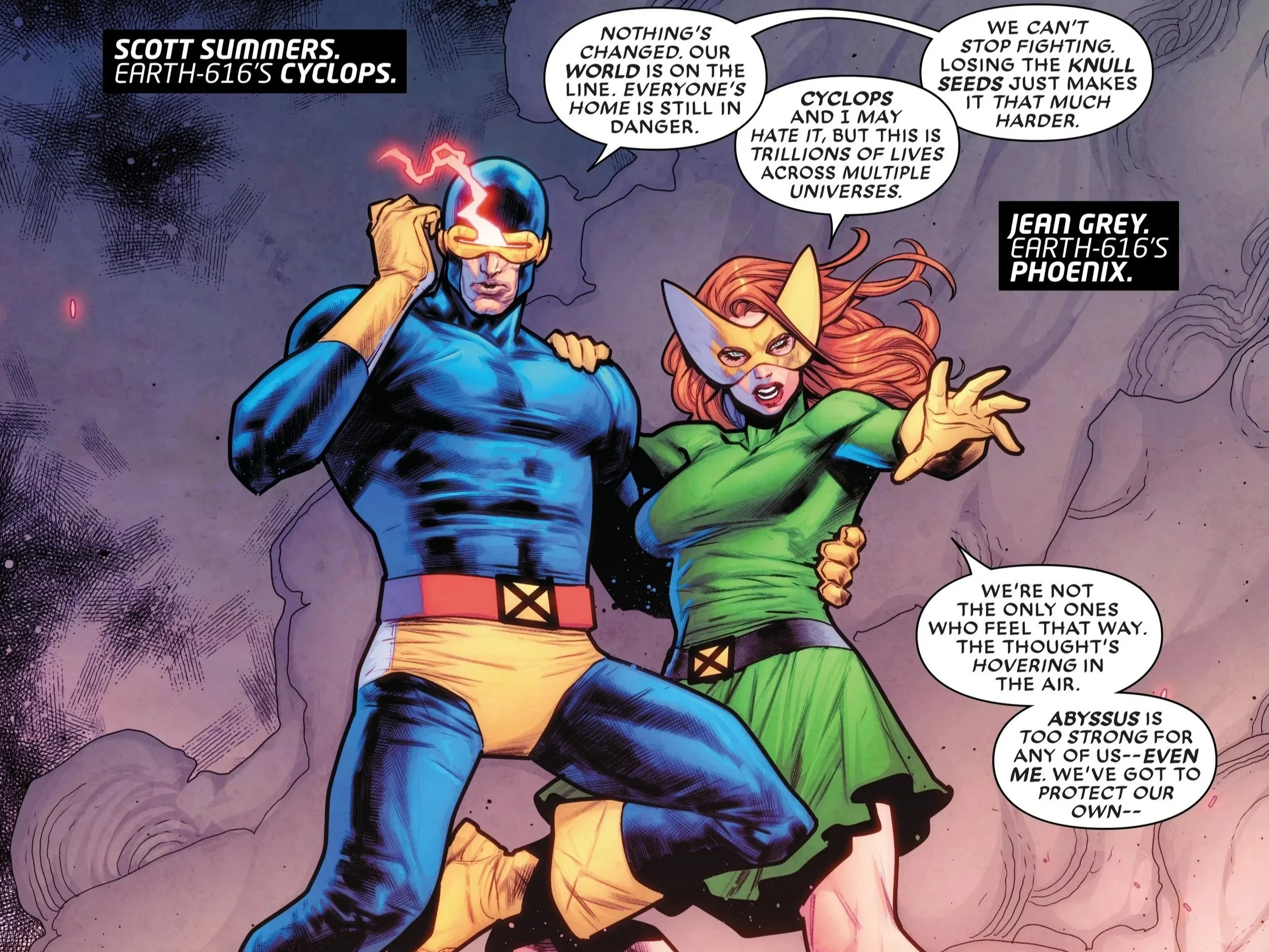 The Abyssal Warriors, one by one, become free of their Knull seeds as Spider-Man 2099 explains the situation. Strange 2099 further explains that they were each infected by Abyssus to force them to fight on his behalf, dulling their minds while stoking their bloodlust. She’s about to mention how they can now all work together when she’s taken off guard by an optic blast courtesy of a Claremont-era 616 Cyclops with Jean Grey at his side. They explain that even without the Knull seeds, they’ll fight to the bitter end to save their worlds, but a sudden arrival by Cyclops 2099 turns the tide as he transmutes 616 Cyclops’ visor into water, causing Scott to lose control of his optic blast. But Jean isn’t so easily dismayed as she uses telekinesis to divert Scott’s blast and pierce the eye of his future counterpart, disrupting his transmutation beam. Phoenix 2099 swoops in to challenge Jean.