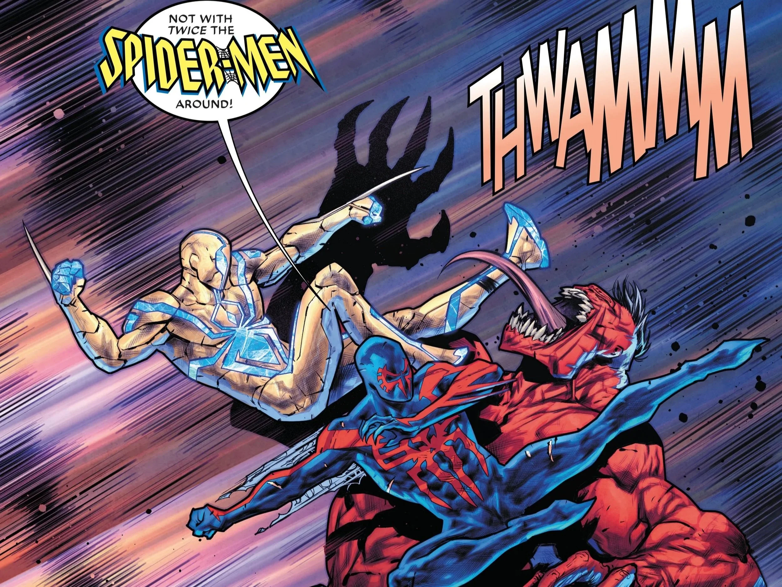 Moving on, we see Carnage from Earth 311 face down Spider-Man 2099, but before he can do anything to Miguel, Spider-Man 3099 jumps in and stabs Carnage in the shoulder with a talon, allowing Miguel to fire his web and pin Carnage to the wall, devoid of the symbiote. Impressed, Miguel gives props to his future counterpart, who, in turn, reveals he actually possesses antibodies that affect symbiotes. Miguel remarks that such an ability is invaluable and suggests that Spider-Man 3099 could likely take down all of the Knullified warriors because of it.