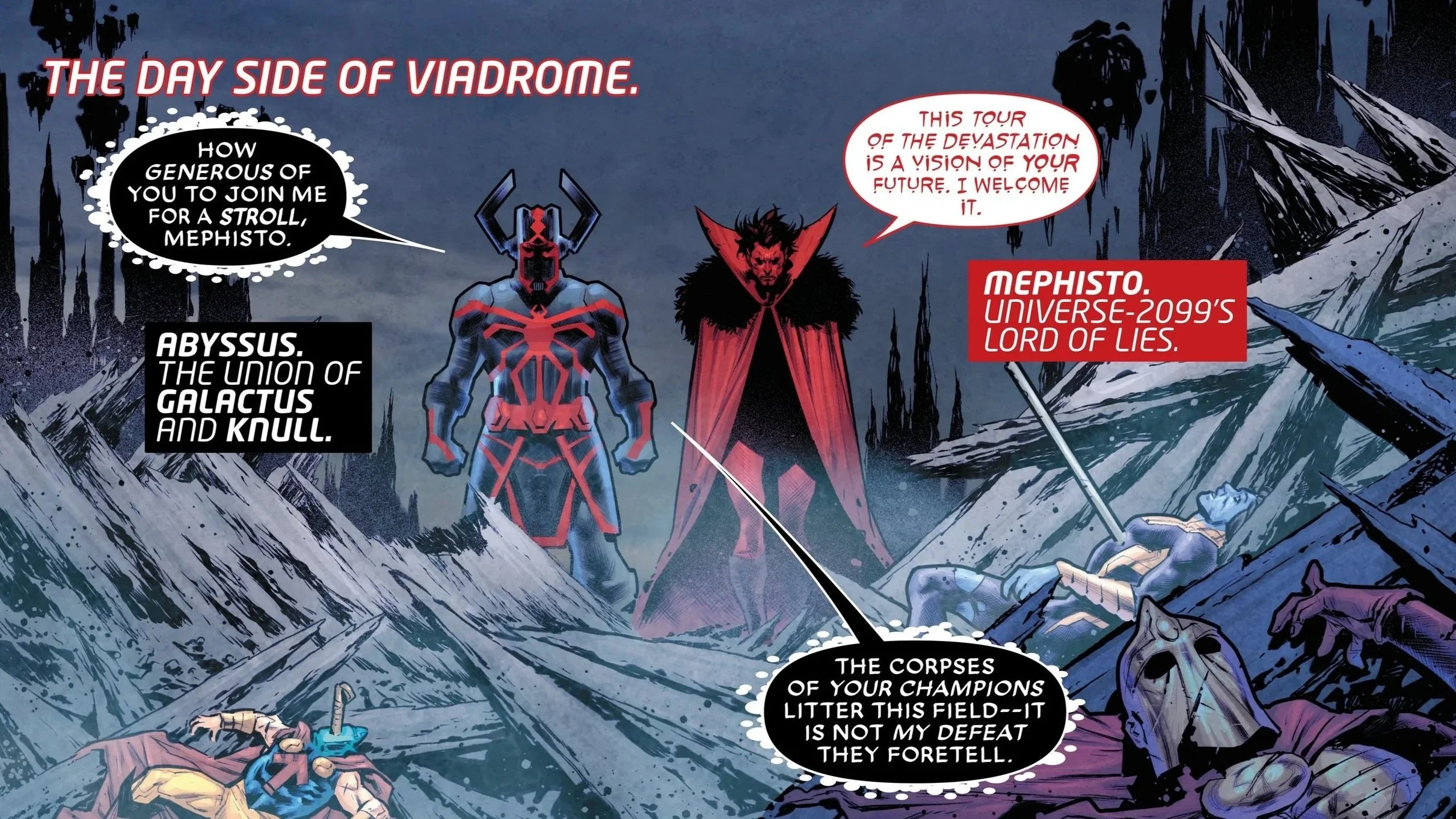 Abyssus and Mephisto take a stroll through the ruins of the battlefield on the other side of Viadrome as they survey the destruction their respective forces have wrought. They play some classic villainous mind games with each other, trying to convince each other that their defeat is all too imminent. Mephisto recalls a prior conversation he had with Silver Surfer 2099, in which the latter informed the former that the words of Bloodweilder, Herald of Abyssus (and formerly known as Dracula), had words for him. Wolverine fights Wolverine once more as the Age of Apocalypse Knull seed–infected Logan takes on Nova 2099. But the grizzled space cop isn’t playing around, as he literally shoves his gun in AoA Logan’s mouth and pulls the trigger, effectively incinerating his flesh and leaving his adamantium skull gleaming as he (at least temporarily) ends the fight.