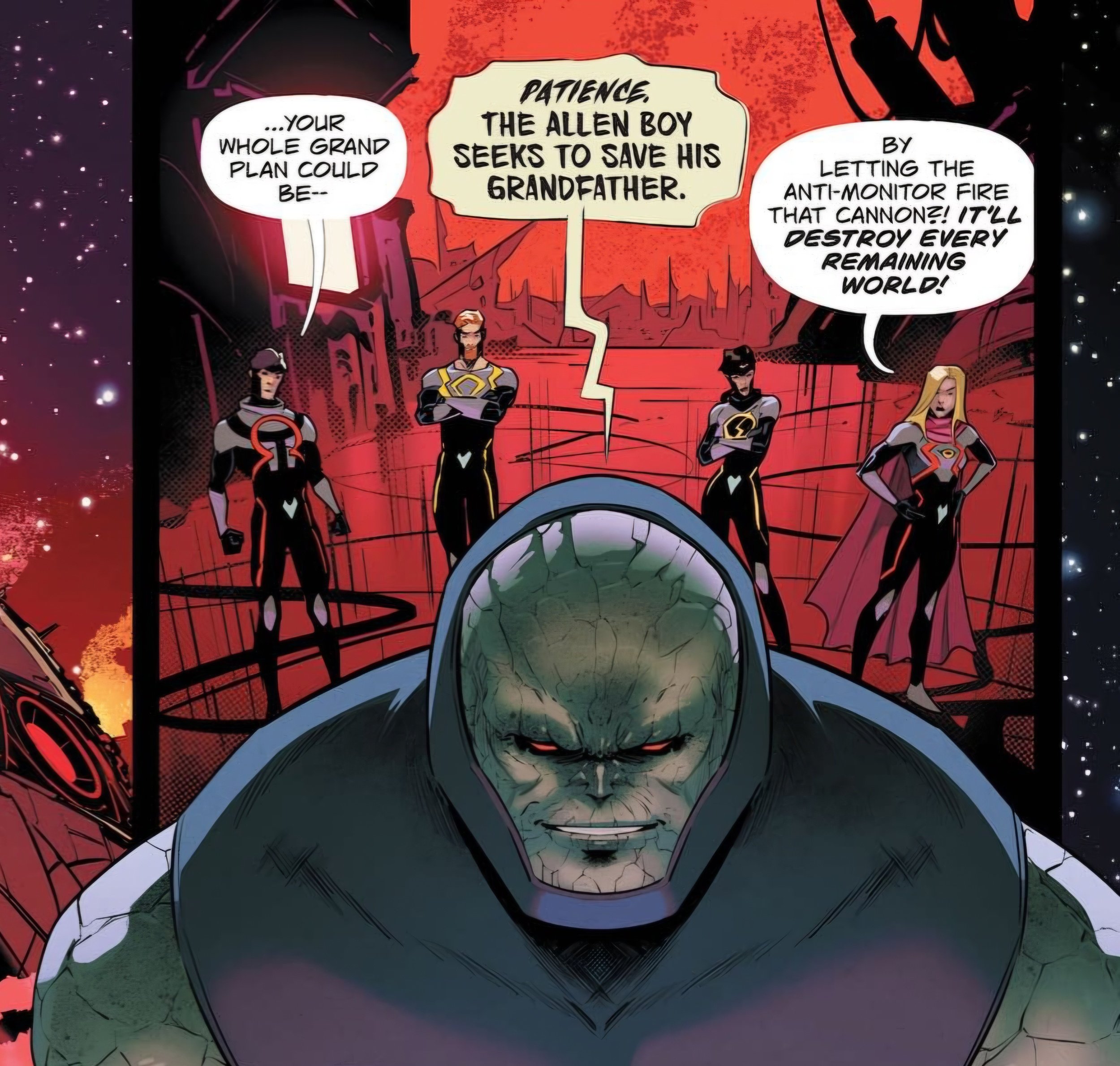 I also think the issue suffers because it has hardly any action set pieces. The issue is very much dialogue-heavy to progress the story. We do get a gnarly moment of Darkseid destroying a Legionnaire for failing to stop Barry Allen, but that is merely two panels. This made the story feel largely rushed, as if it were desperate to get to the conclusion as quickly as possible with little to show for it.