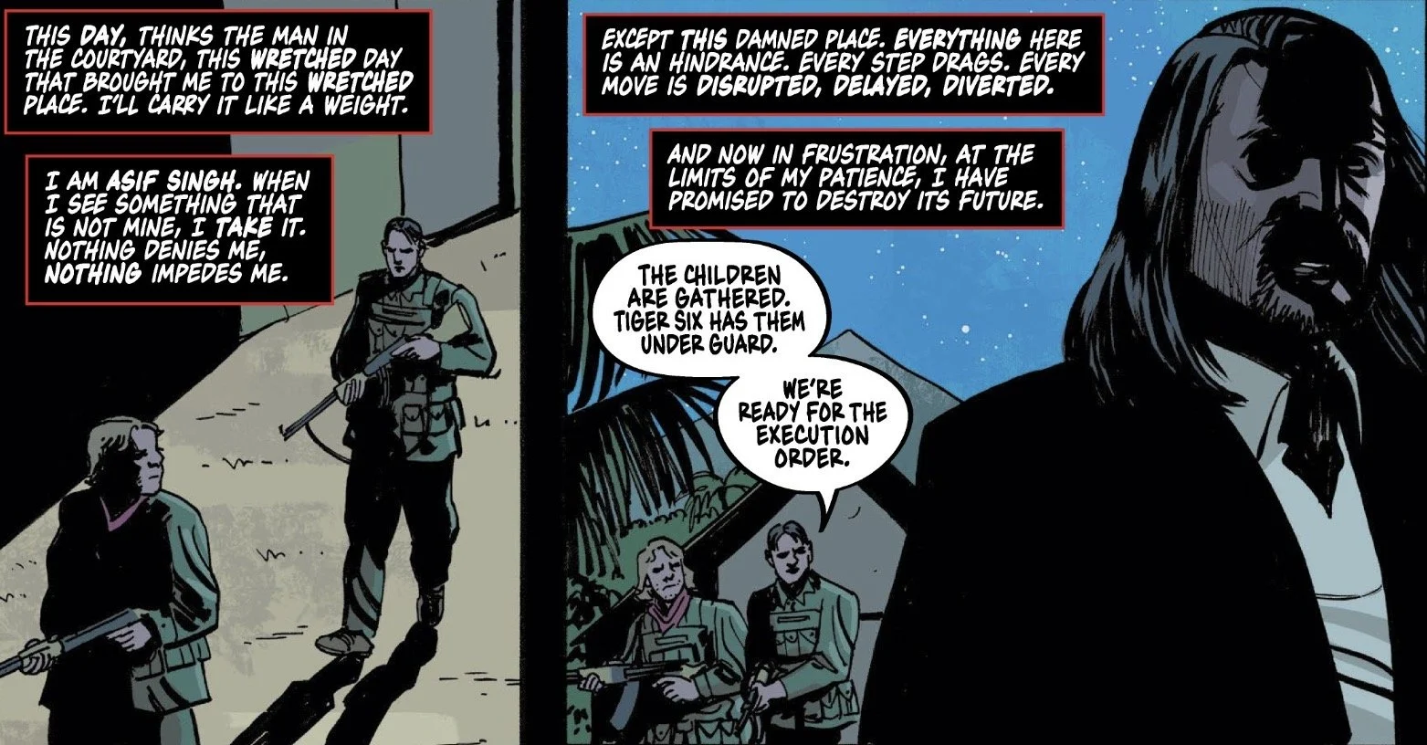 The narrator changed from issue to issue throughout the arc; the majority of the first few issues were told by the Phantom himself, but once he was wounded, the perspective shifted to Guran. Here at the end, it alternates between the Phantom, Guran, and Asif Singh. This helped change the pace, as the Phantom’s internal monologue is a little too wry and doesn’t take much seriously, which can occasionally undercut the stakes.