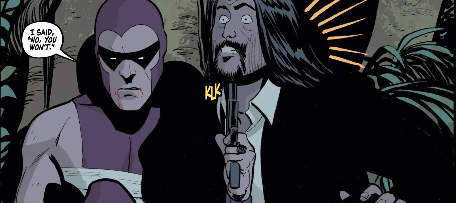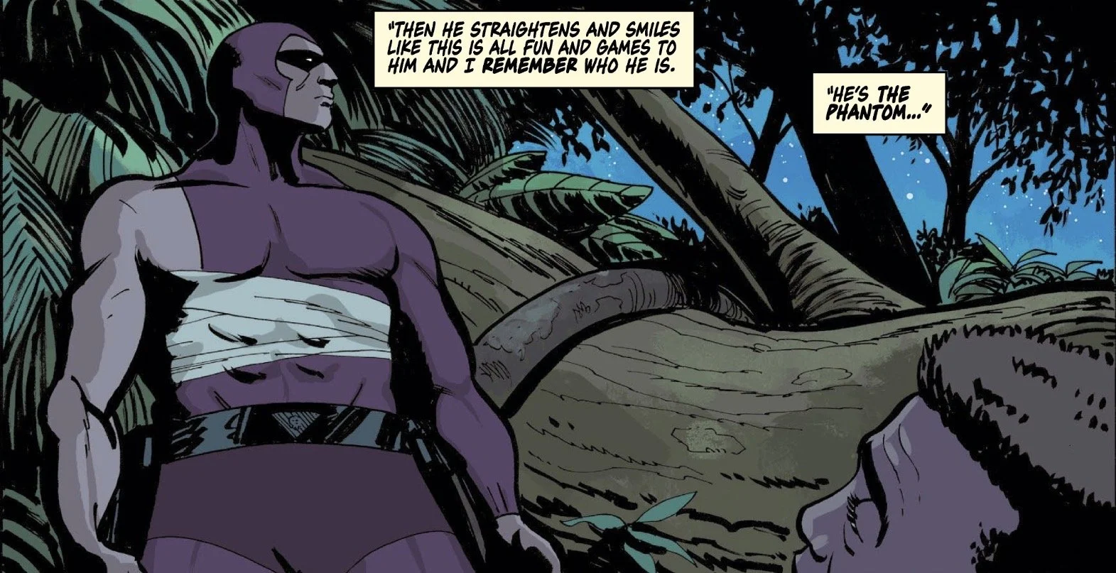 Olson’s art, on the other hand, has been inconsistent throughout the run, with this finale being his weakest work in several ways. Some of the faces are a bit off, and there are panels where the proportions are completely out of whack. Furthermore, while the choreography was solid in previous issues, much of the action here was difficult to follow—starting with an over-reliance on close-ups. In one specific scene, the Phantom has to escape being choked by a vine, and it is honestly unclear how he actually gets free. It’s a disappointing visual hiccup, and perhaps that’s the price to pay for maintaining a consistent creative team on a tight schedule.