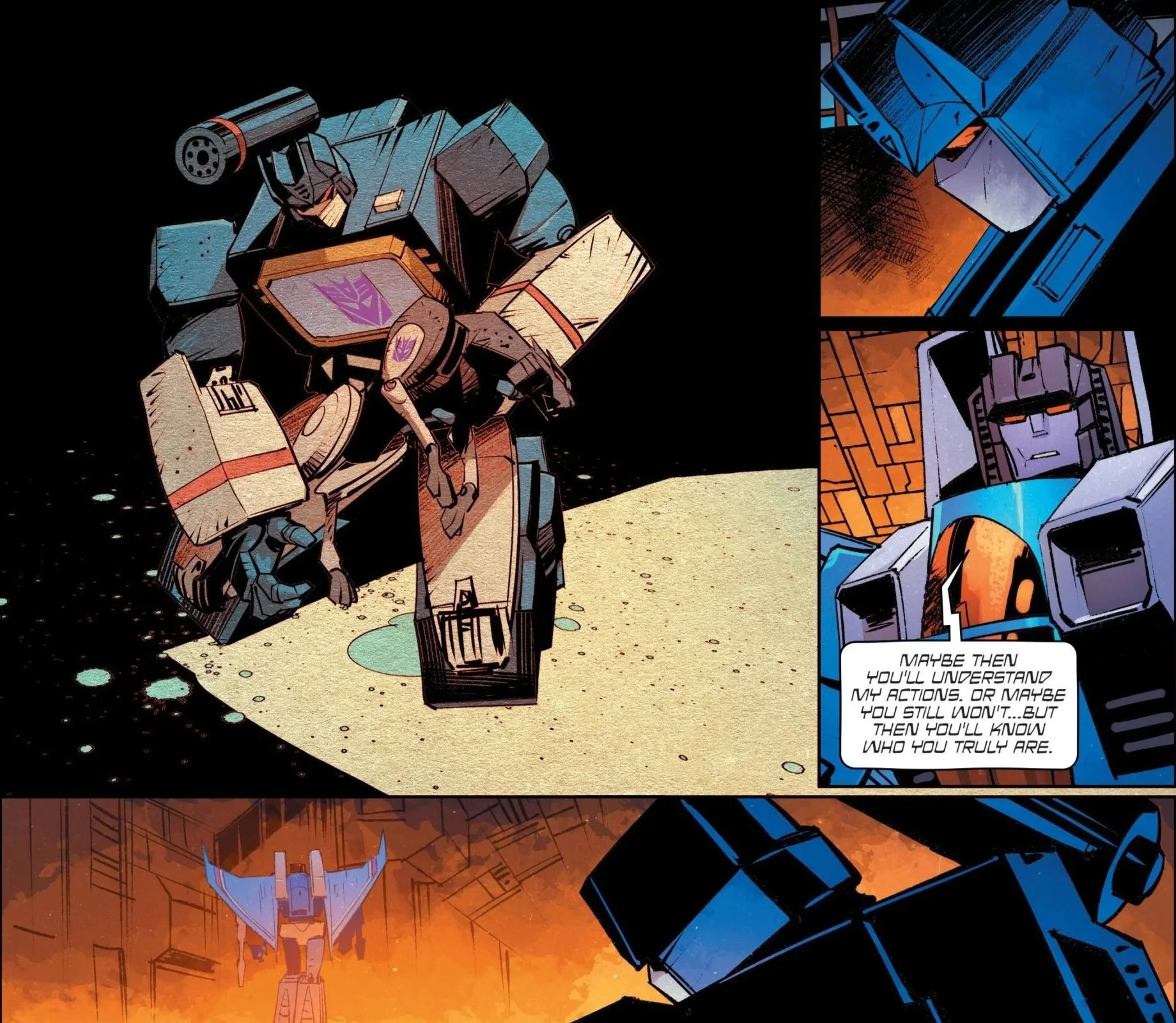 Soundwave outwardly insists that his allegiance has not wavered, but the art tells a different story. We see him reflecting on how his grief over Ravage was dismissed by his so-called brothers. It feels like the first genuine crack in his certainty. Whether this leads to redemption or something messier remains to be seen, but the seed has clearly been planted.
