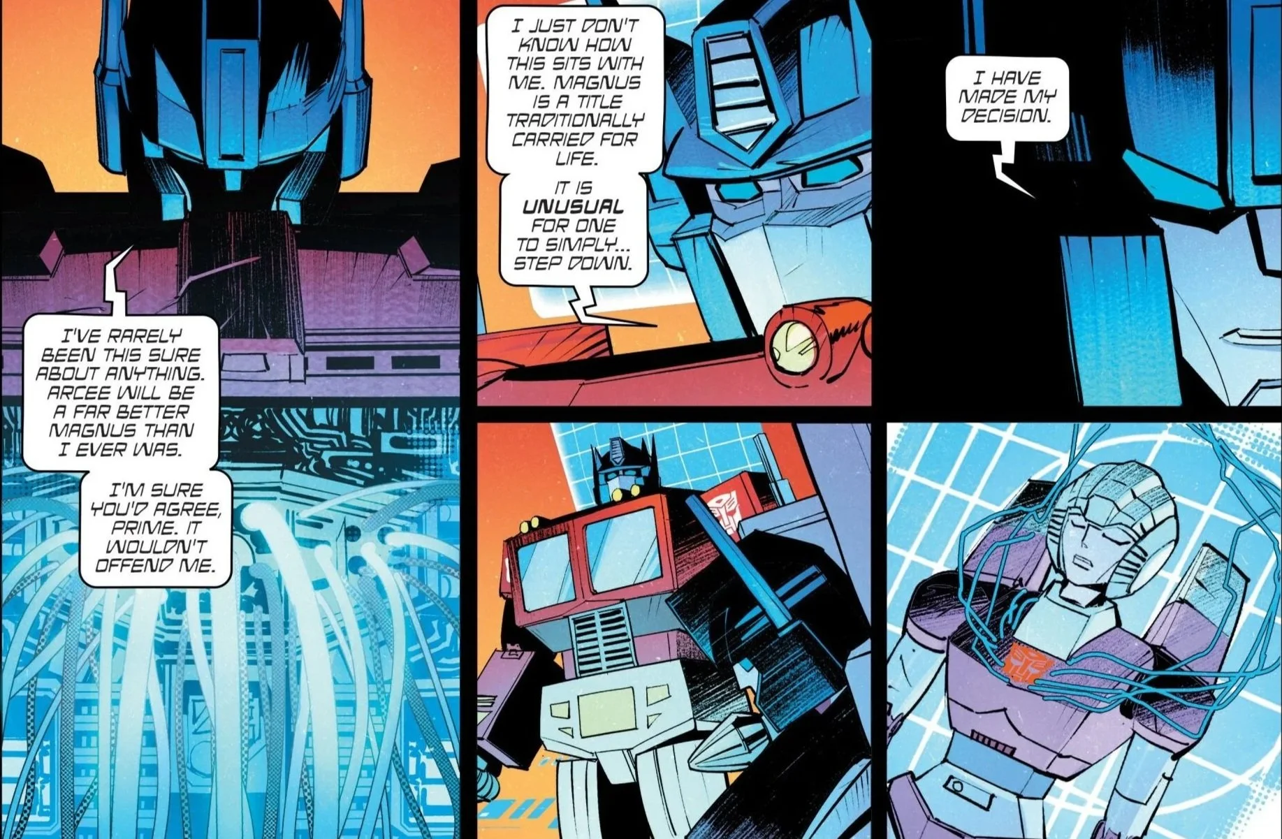 Although Optimus Prime convinces Ultra Magnus to retain his designation, Arcee clearly steps into the role as the primary Magnus of the Autobots. That title carries immense weight within the mythology of the Transformers and within this book specifically. The added physical mass of her redesign mirrors the emotional and moral weight she is now expected to carry.