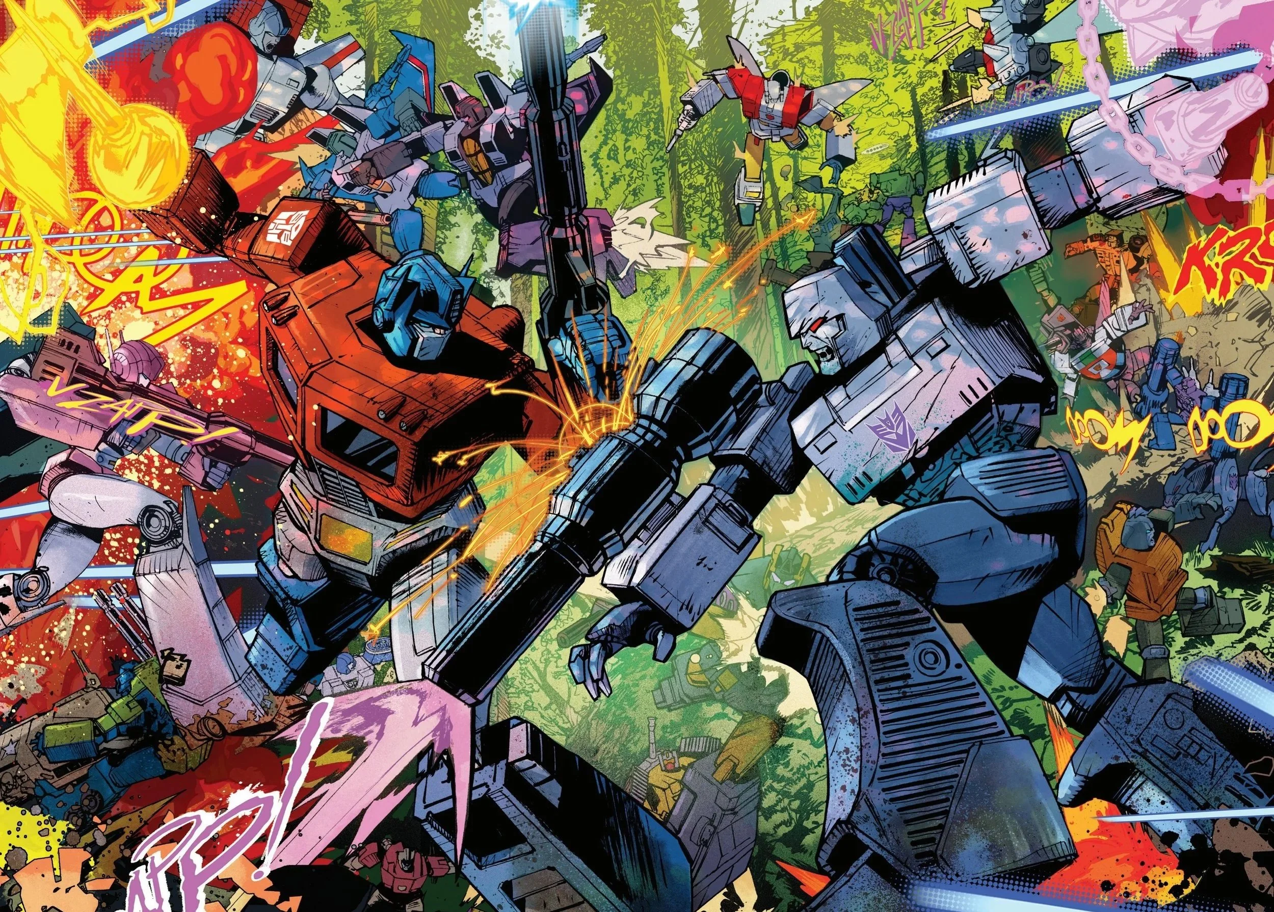 What follows is one of the most sustained action sequences of the entire run. Autobots and Decepticons pour into the forest near the Ark, and the fight escalates almost instantly. Laser blasts rip through trees. Massive bodies slam into the earth. Characters who have been circling each other for months finally collide. Kirkman abandons the slower, multi-plot structure of recent issues and commits fully to the battlefield. And it works.