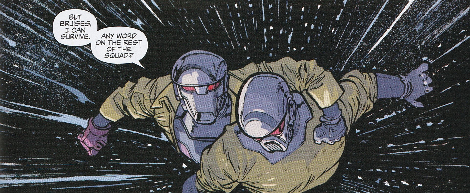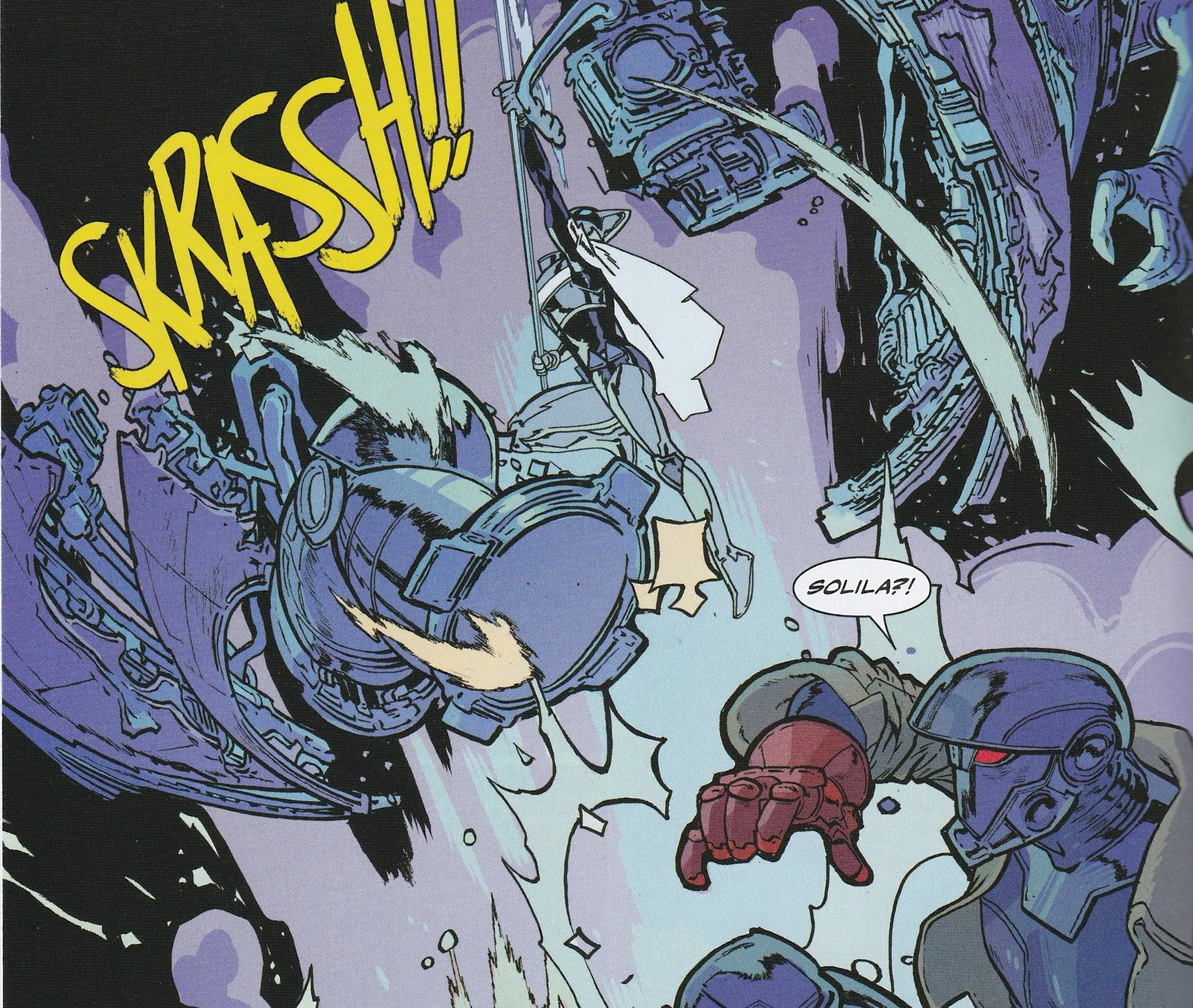 Darak notices this while talking to a now healed Garad after arriving back home. He launches himself down to the ground to try and help the people of Agorria. He knows that he needs to try to get to his father because as the leader of Agorria, he knows he has a target on his back. But as he's overwhelmed by the strength of these Sharkticons, he's saved by the only person who has had his back this whole story when things get tough.