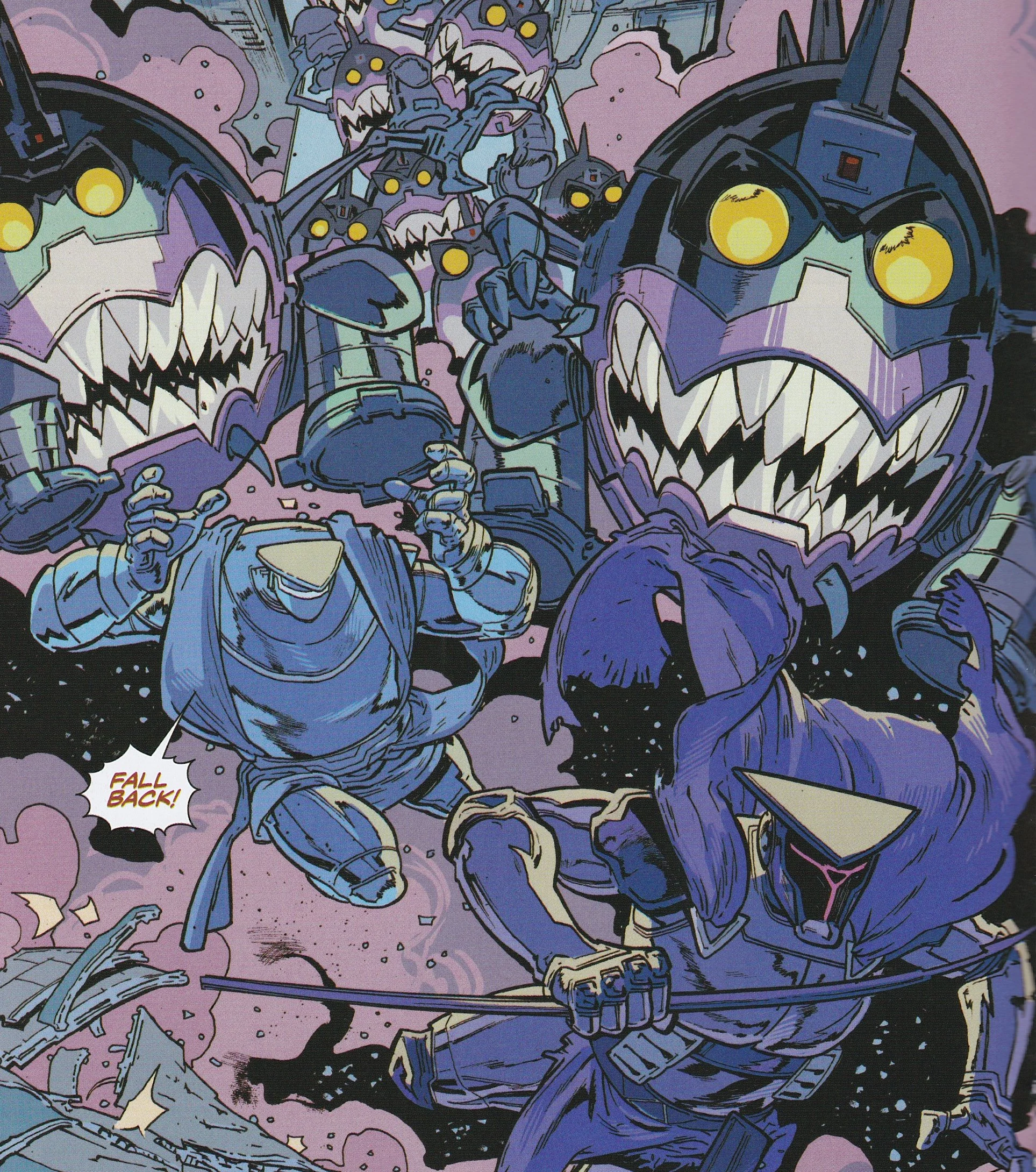 These fish-like robotic creatures called Sharkticons leave the ship and lunge towards Zalilak and Proxima who've made a truce to protect Zertonia from these creatures. And after this war is over, they promise to finish the battle that they started in Issue #25.