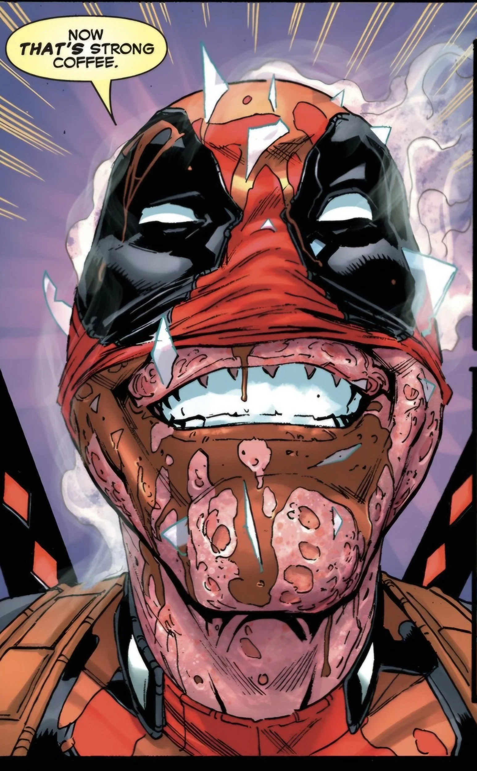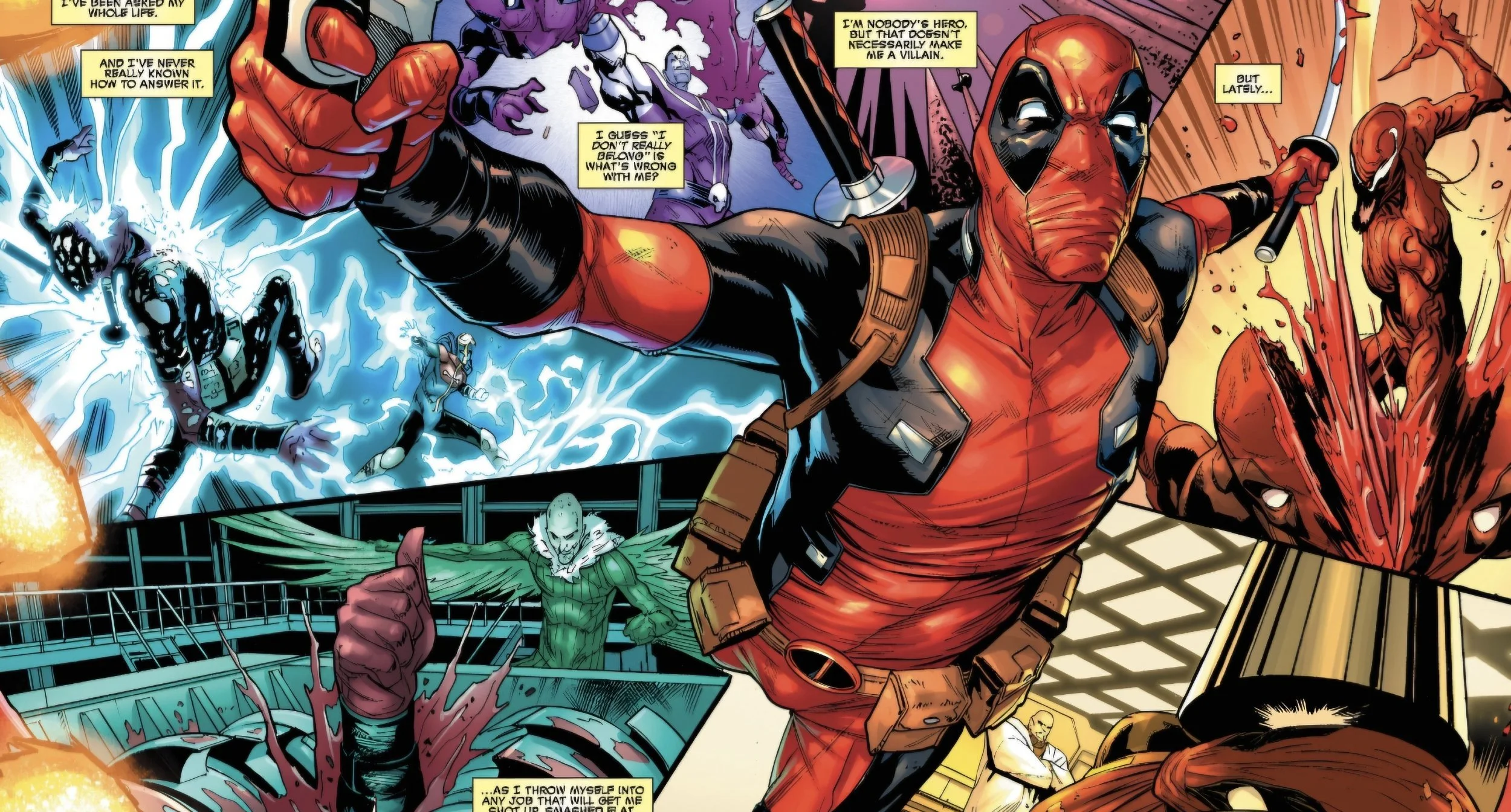 There were a few gnarly pages where the comic illustrates how impervious to pain Wade is by putting him through shredders, industrial clamps, and various other life-endangering machinery at the hands of villains. I found that did a really good job of conveying the visual punishment the character can endure.