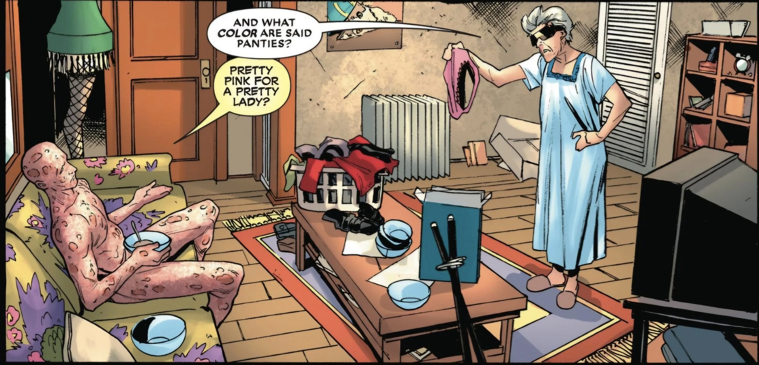 Already, this first issue strikes a dark tone, giving us a much darker, sadder Deadpool than we are used to. There are still laughs, but they are much more toned down to reflect that Wade is a man without a purpose or any will. A big way this is communicated is the fact that he’s now living on Blind Al’s sofa with his dirty laundry littered around the house—much to her chagrin. Benjamin Percy really does a great job at emphasizing the sad state Deadpool’s life has become.