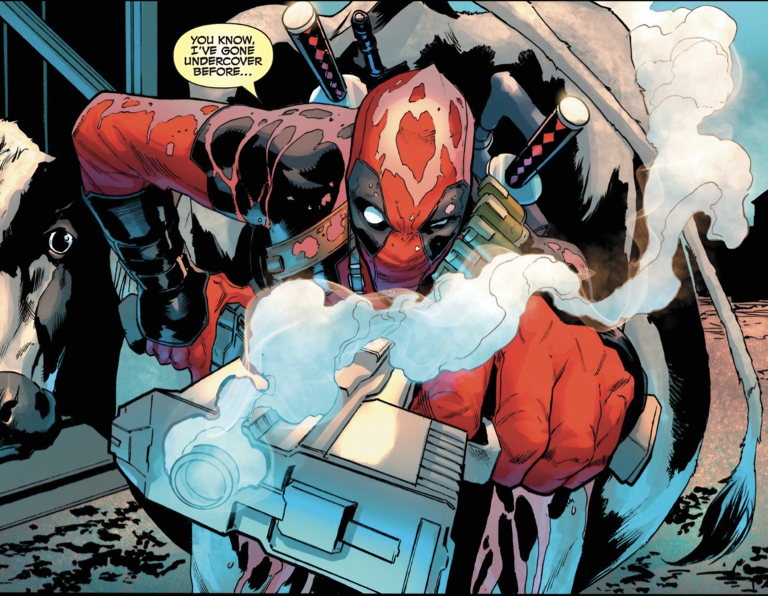 The comic starts in an extremely absurd way, with Deadpool bursting out of a cow’s backside only to kill a bunch of gang members. I know I just went on an entire spiel about how the character isn’t all about comedy now, but trust me, okay? Something is different this time; he seems much more reckless, almost begging for the gang members to hurt him and cause him pain, which, as we are told by the editor's notes, won’t kill him but will still hurt a hell of a lot.