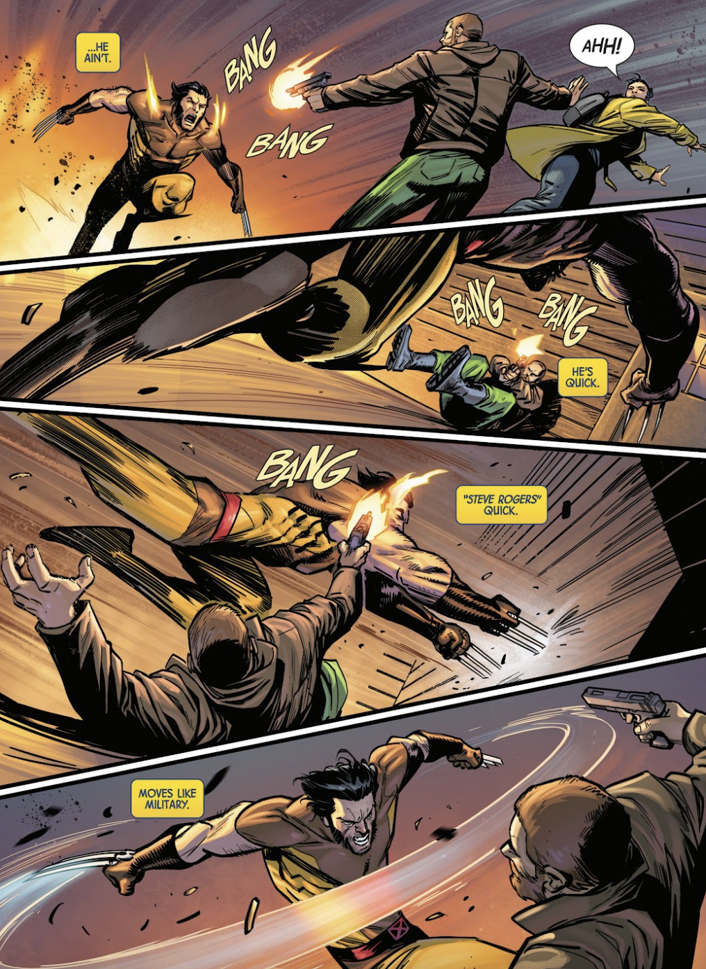Getting back to the issue, we pick up right where we left off at the end of issue #1: A man with a star on his chest, similar to the Captain America we all know, has Teri O’Barnes at his mercy with a gun pointed at the back of her head as Wolverine looks on. Despite seeing the glowing star and a version of the famous Captain America shield, Wolverine isn’t quite sure “who the F*** he’s dealing with.” He makes a choice: Since he sees the star and the shield, he thinks that this man won’t put a bullet in the back of a woman’s skull. He bets correctly as he charges Colton and the two begin to brawl inside his cabin in the woods. The brawl itself is one of the coolest parts of the issue but ultimately it ends when Wolverine realizes that this mysterious figure isn’t fighting to the best of his abilities: he refuses to pick up his shield even when he's pinned to the wall. O’Barnes finally makes the connection and tells Wolverine who this guy really is: David Colton, the Unknown Captain America.