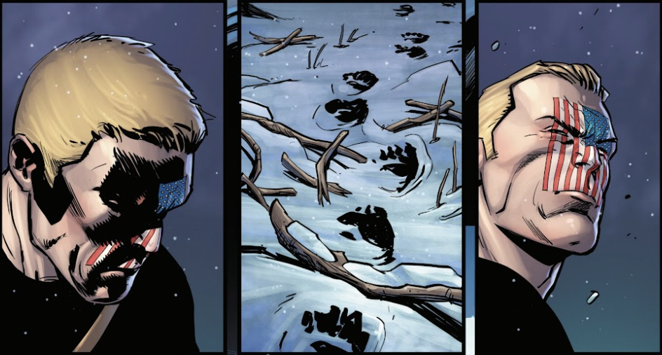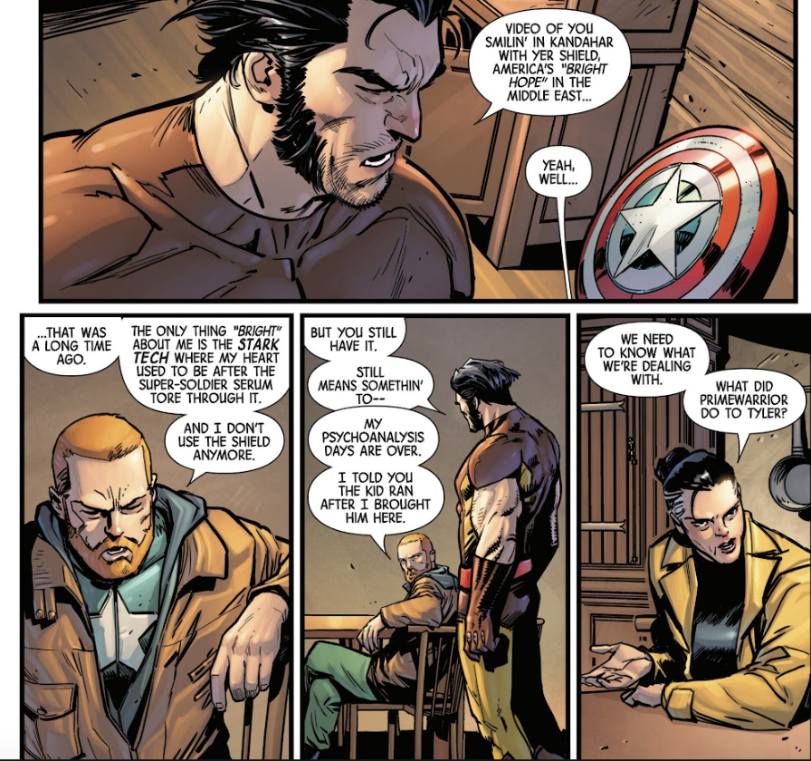 Back in the present, Nuke and members of the PRIMEWARRIOR organization are on the hunt for Tyler, Wolverine and O’Barnes. Deep in the woods, Ash tells the squad that the “suppression” treatment he used on Tyler is going to wear off soon and that if they find O’Barnes she can lead them to Tyler. Everything seems to be going to plan until the group notices that Nuke is gone; seemingly off to chase Wolverine on his own. Meanwhile, Wolverine and O’Barnes talk with David Colton and basically have a conversation that informs the reader about who Colton is and where he comes from. Colton says he doesn't use the shield anymore and that his heart has been replaced by a Stark Tech replacement after the super slider serum “tore through [his original heart].”