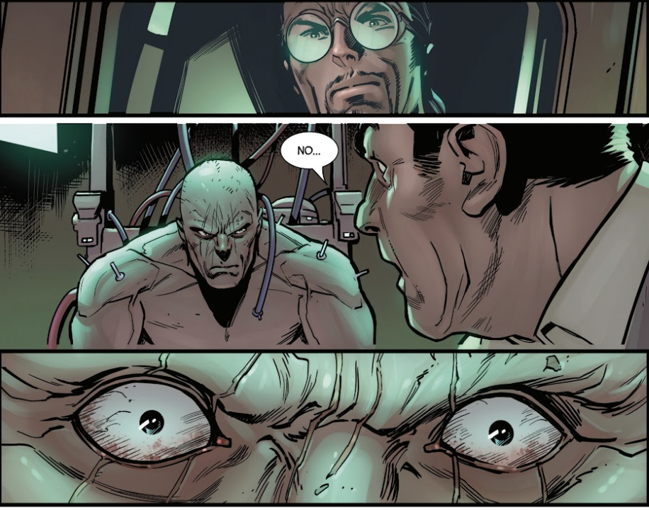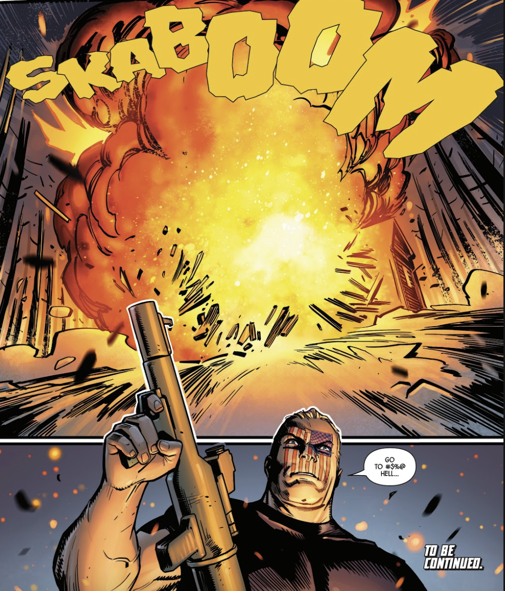 With that big reveal in the cabin, the story shifts into another flashback. We rejoin Nuke during his early days as a part of the Weapon Plus program as he tracks down and fights a Grizzly Bear. It doesn’t go well for him and Professor Ford again humiliates his partner Ash by screaming at him and slapping him in front of other scientists and workers due to Nuke’s inability to defeat the bear in combat. It’s clear there’s massive tension between the two scientists and it seems to be foreshadowing a confrontation between the two soon… I liked this flashback scene as well. This continued context given to Nuke’s journey to the point he’s currently at in his life is appreciated because it's clear he’s going to be a big part of this story going forward and possibly even into the massive Armageddon event in June. Zdarsky’s narrative choices in this issue have hit a home run with me.