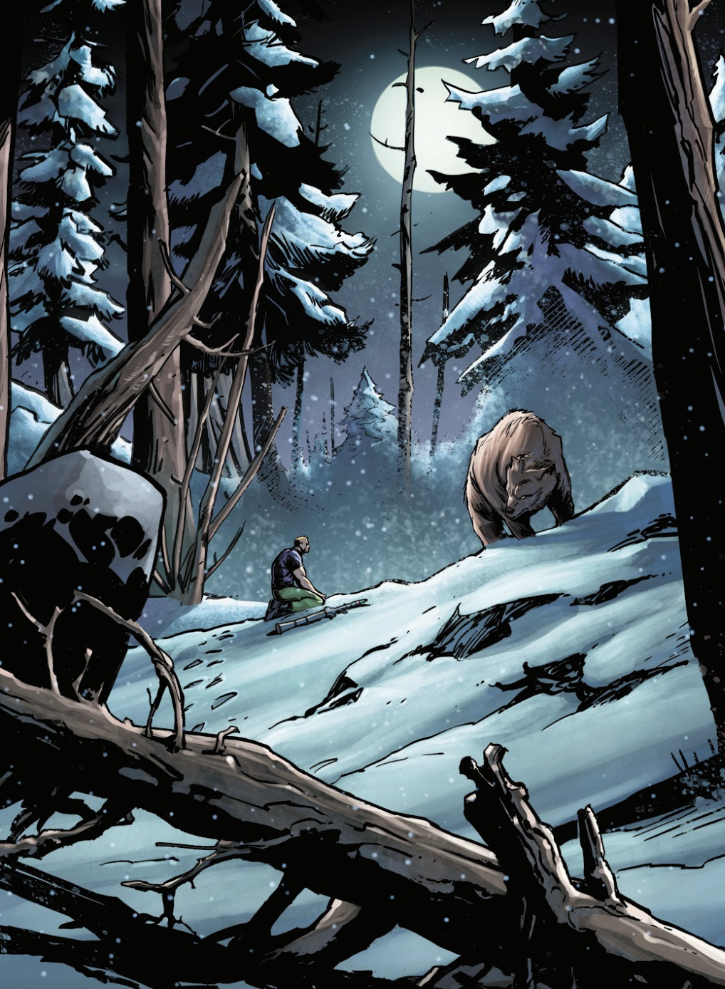 We bounce around again and this time we rejoin Nuke in his hunt. Nuke runs into a bear once again, just like he did years earlier, and pops a white pill to slow his heart rate and focus. We get a beautiful splash panel from the art team of Nuke kneeling down in the snow covered woods with the moon in the sky and the imposing grizzly bear looking ready to strike. We don’t see what happens to the bear but it's safe to say that the results for Nuke are much different this time around. This scene gives way to our final flashback of issue #2 where we see Nuke, Professor Ford and the scientist Ash explaining how three different kinds of pills will work for him when he needs them: white to bring a sense of calm, blue for maintaining his normal state and red for increasing his adrenaline. We finally find out why Professor Ford is only in the flashback scenes as the red pill is missing and with Ash, who has now locked the door behind him and is watching from a separate room, looking on we are left to wonder just how badly Nuke killed Ford as his eyes open in a wild rage. These flashbacks give a real weight to Nuke’s story. We can see the parallels between him and Wolverine. Both men had their lives upended and altered by sick people who only wanted to create weapons out of them. You can understand why Nuke is just a bit crazy.