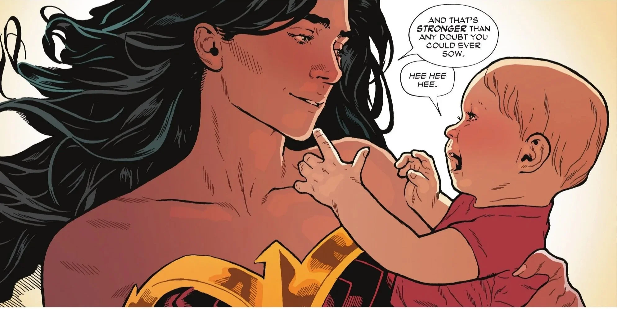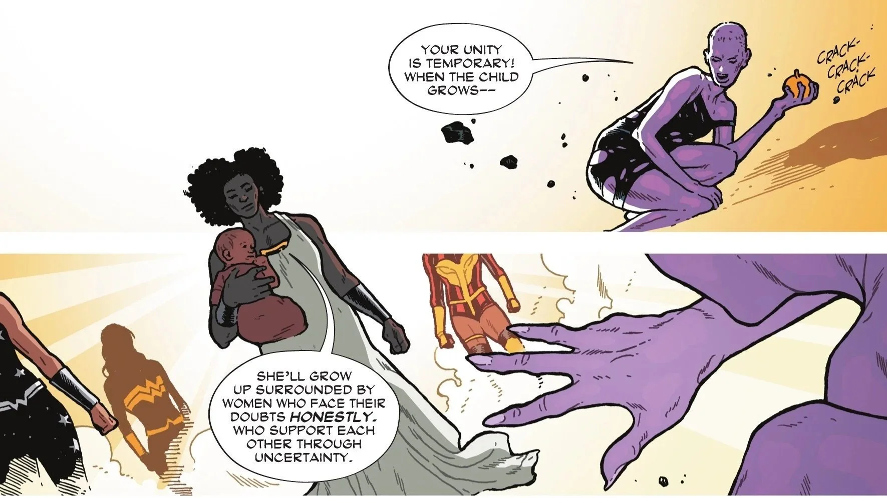 Bia steps forward with Lizzie in tow. She says that the daughter of Diana will grow up surrounded by women who will show her that they face their doubts together and honestly. The innocence wafting from Lizzie literally burns Eris as she crawls away. Eris screams that the child does not know discord or conflict. Wonder Woman agrees and takes her daughter back from Bia. She explains that the infant knows only love, joy, and acceptance.