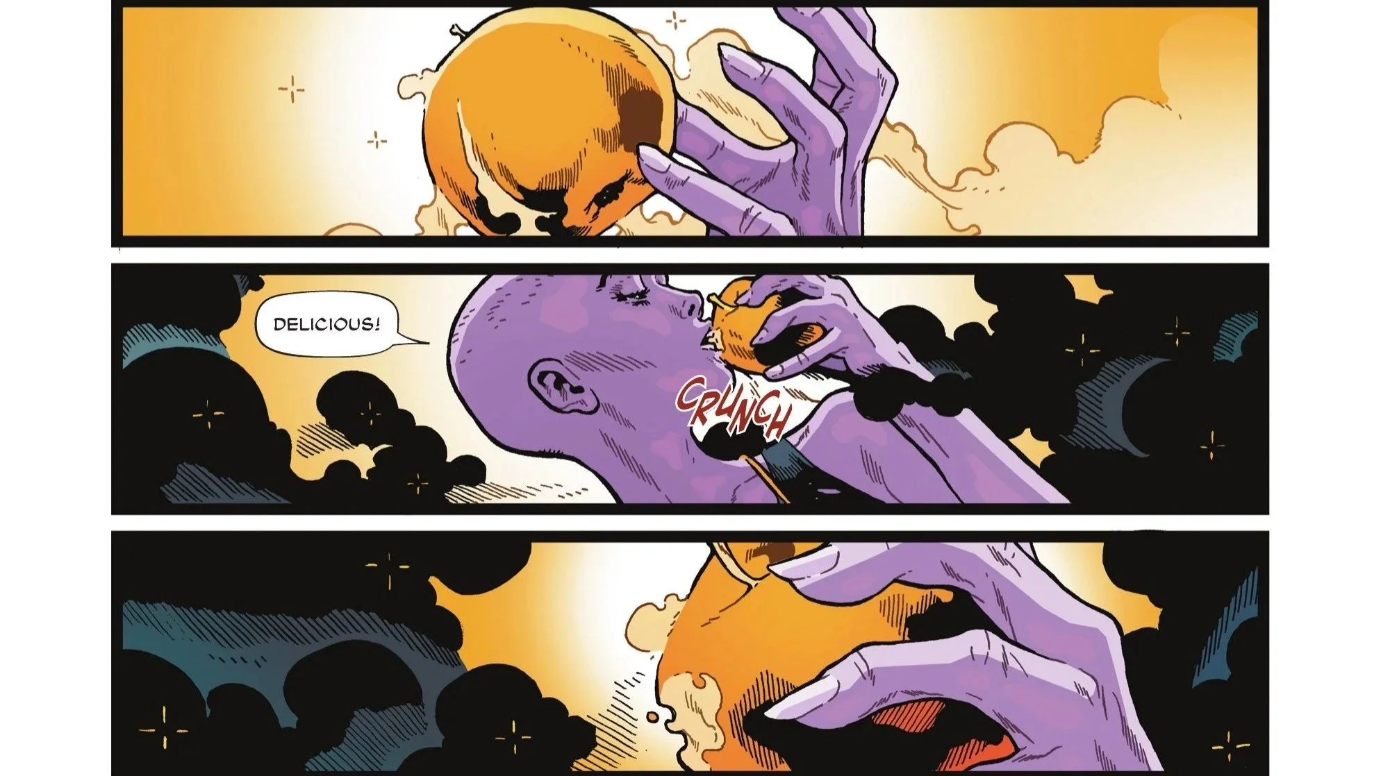 Eventually, the Amazons pause their battle just in time to see Eris floating above them. The Goddess is all too pleased to harvest their strife. She tells the Amazons not to stop on her account. She mocks them for using a child to validate themselves, specifically pointing out their collective fears and self-doubt before taking a bite of the golden apple.